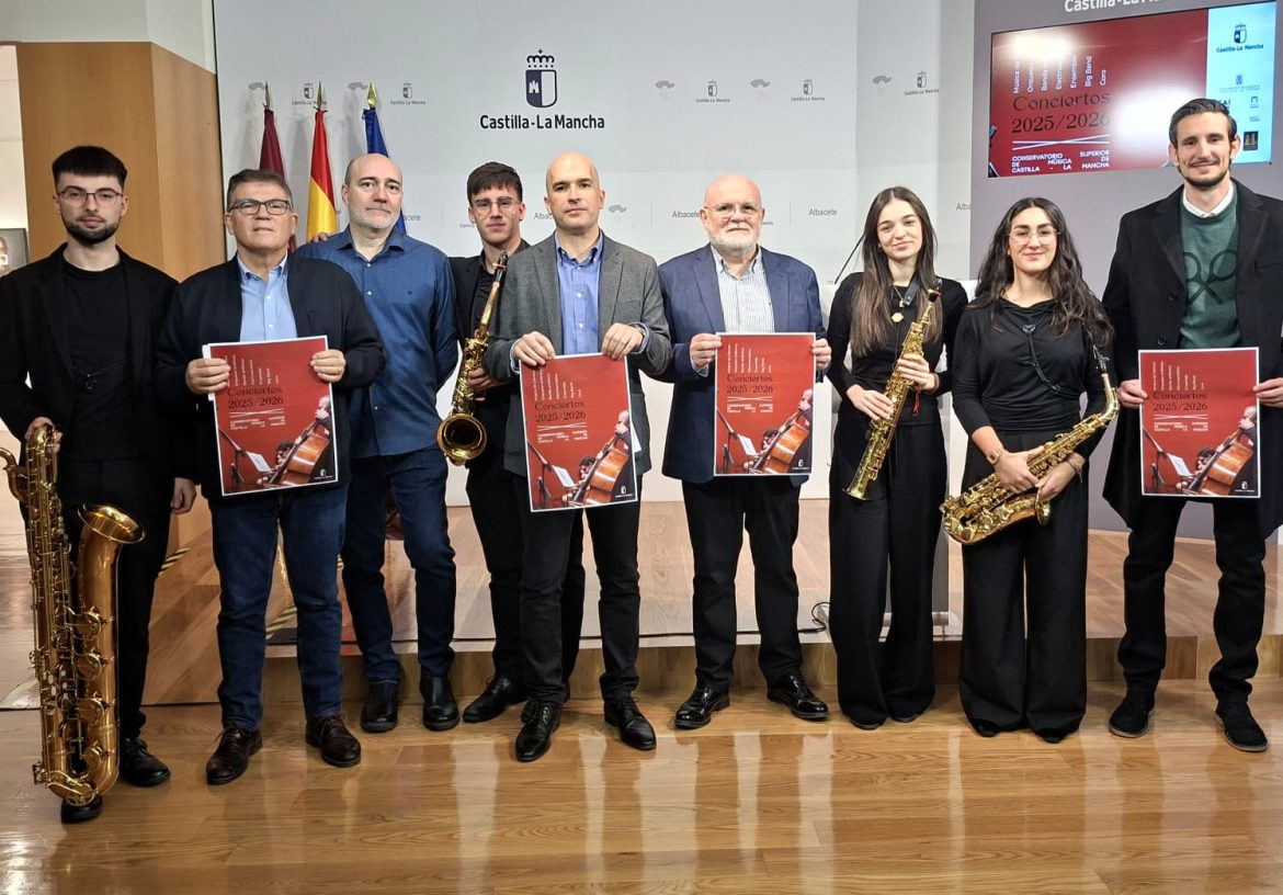 El delegado de la Junta en Albacete, Pedro Antonio Ruiz Santos; el delegado provincial de Educación Cultura y Deportes, Diego Pérez; y el director del Conservatorio Superior de Música de Castilla-La Mancha (CSMCLM), Julián Sánchez, han presentado la programación de actividades, conciertos y eventos previstos por el centro para el curso 2025/2026, un calendario que consolida a Albacete como referente educativo, cultural y artístico en la región.