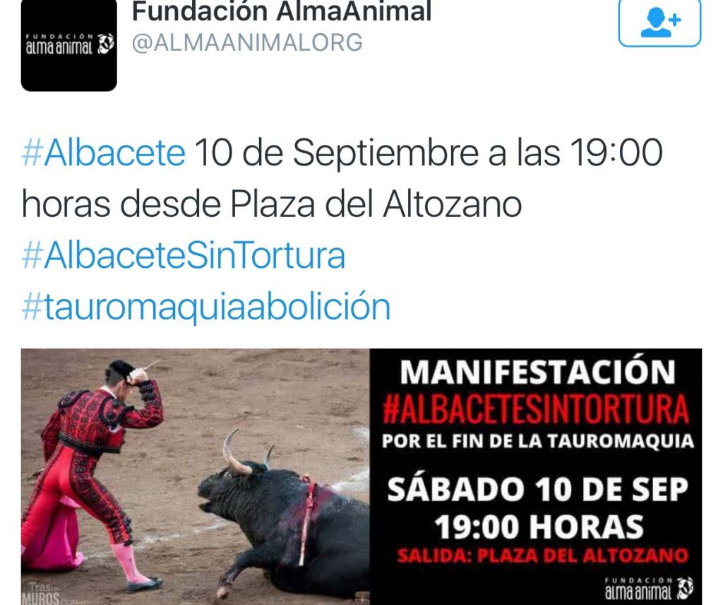La Fundación Alma Animal ha convocado una manifestación antitaurina para la Feria de Albacete, que tendrá lugar el sábado 10 de septiembre, a las 19.00 horas, desde la Plaza del Altozano. La han convocado bajo el lema «Albacete sin tortura».