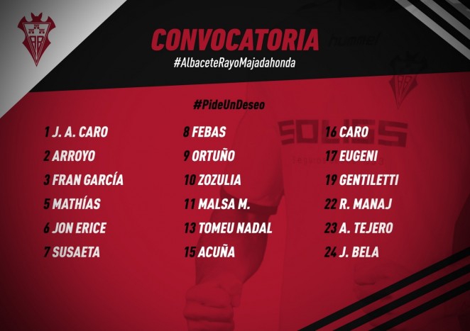 Los jugadores convocados están citados mañana a las 10:45 horas en el Carlos Belmonte para acudir al Hotel Beatriz a comer y descansar antes del partido.