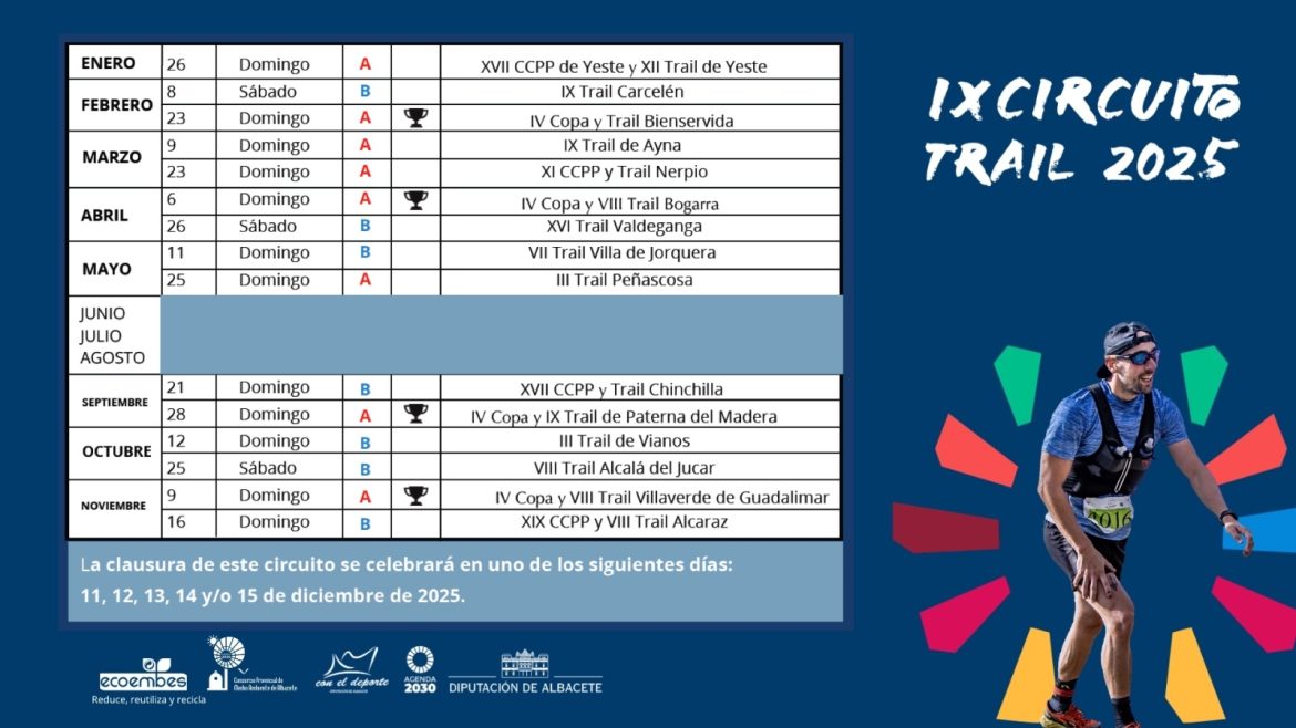 La Copa Trail de la Diputación de Albacete sigue ganando adeptos año tras año, respondiendo a la demanda de los y las atletas de pruebas más exigentes y de mayor distancia. Este año, el formato se mantiene con cuatro carreras que recorrerán algunos de los parajes más espectaculares de la provincia. Así, tras la primera cita de Bienservida, el 6 de abril, la Copa llegará a Bogarra y, el 28 de septiembre, a Paterna del Madera para concluir, el 9 de noviembre, en Villaverde del Guadalimar.