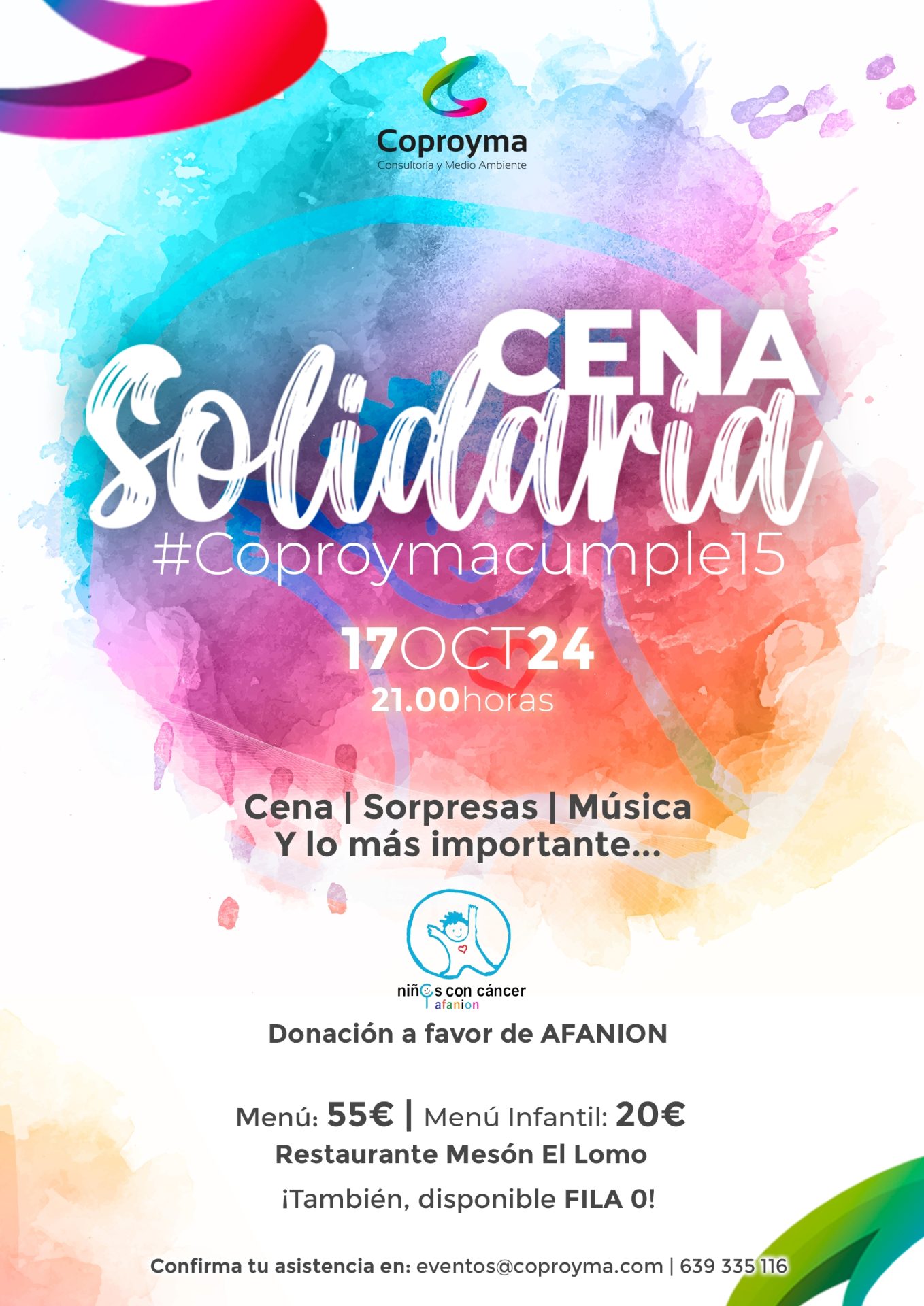 El próximo jueves, 17 de octubre, Coproyma, empresa albaceteña especializada en consultoría y en gestión ambiental, celebra su XV Aniversario, motivo por el cual ha decidido conmemorar esta fecha con una Cena Solidaria a favor de AFANION, la Asociación de Familias de Niños con Cáncer de Castilla-La Mancha.