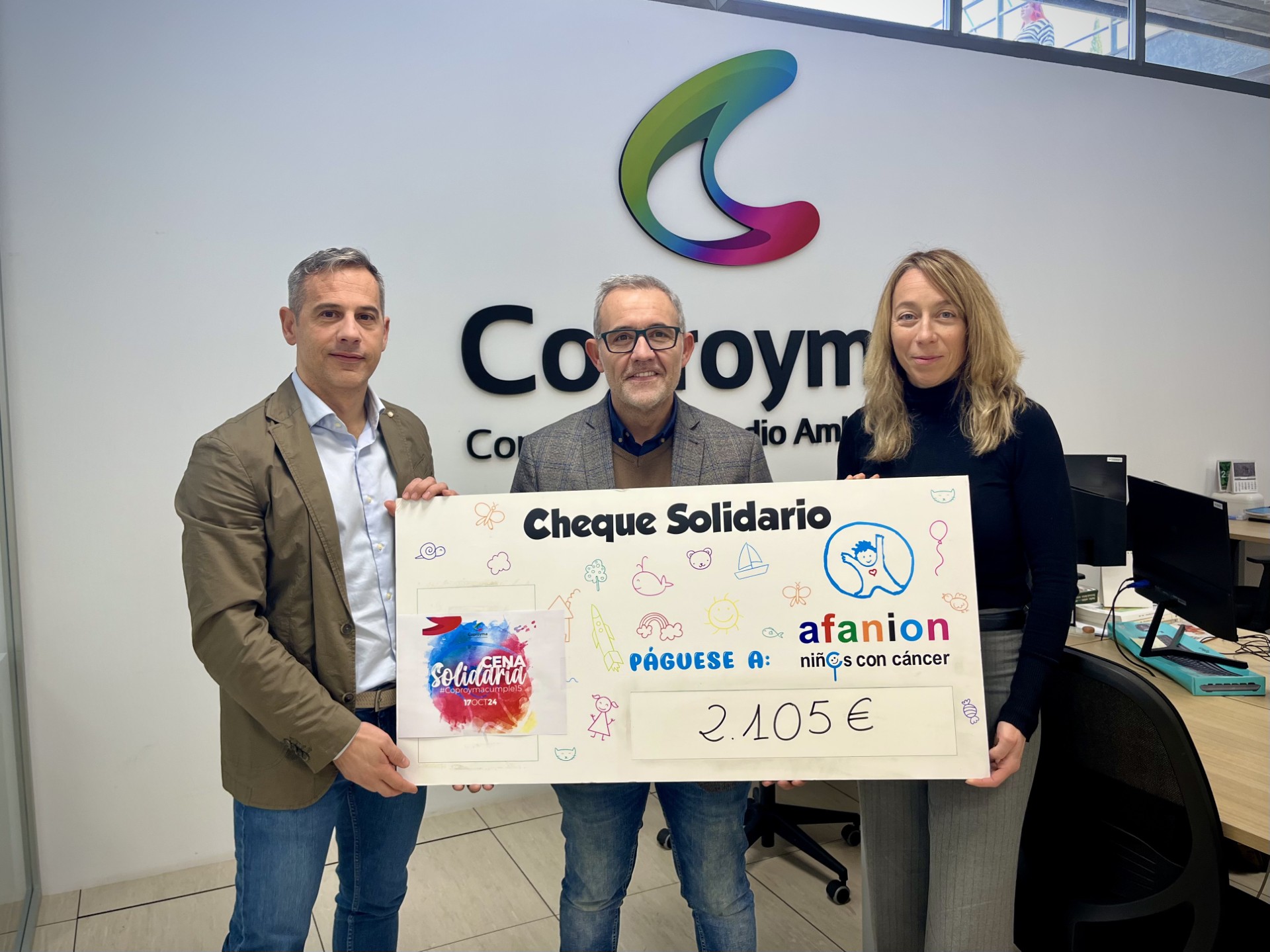 Y fue el pasado miércoles, día 18 de diciembre, cuando los CEO de Coproyma, Vanesa Serrano y Norber López, hicieron entrega de la recaudación obtenida a Juan García, el presidente de la asociación. Un cheque valorado en 2.105 €, fruto de las donaciones que realizaron los asistentes al evento, rifas celebradas y de todo aquel que quiso participar, aunque no pudiera estar presente.