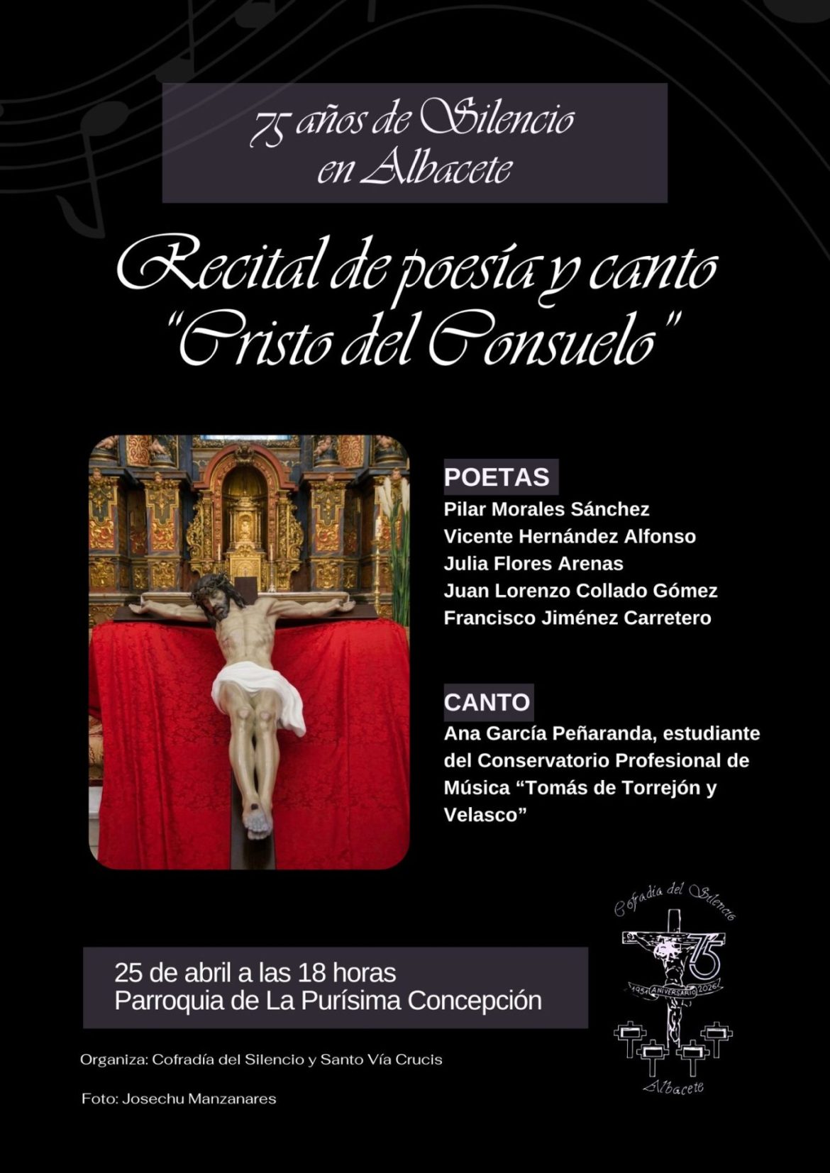 Continuando con los actos conmemorativos del 75 Aniversario de Cofradía del Silencio y Santo Via Crucis de Albacete, el sábado 25 de abril a las 18:00 horas, tendrá lugar en la Iglesia Parroquial de la Purísima el recital de poesía y canto dedicado al Santísimo Cristo del Consuelo. Sin duda uno de los acontecimientos más emotivos de este año tan especial, de marcado acento cultural y preparado como todos los eventos con mucho cariño.