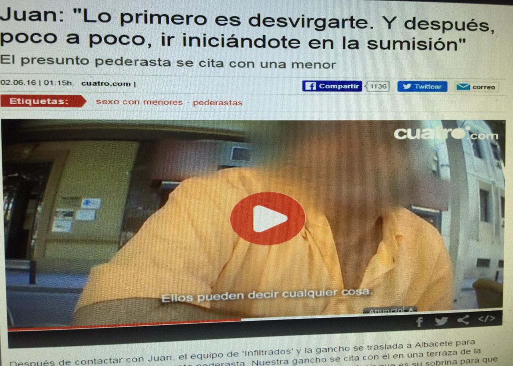 Después de contactar con Juan, el equipo de ‘Infiltrados’ y la gancho se traslada a Albacete para grabar el encuentro con el presunto pederasta. Nuestra gancho se cita con él en una terraza de la ciudad manchega, él le explica que si alguien les ve por la calle, va a decir que es su sobrina para que nadie sospeche de su relación. La diferencia de edad entre ambos es bastante llamativa pero a él no le importa, de hecho es lo que más le llama la atención, «empezaría con caricias, besos, los calentamientos que se suelen llamar», le explica a la joven.