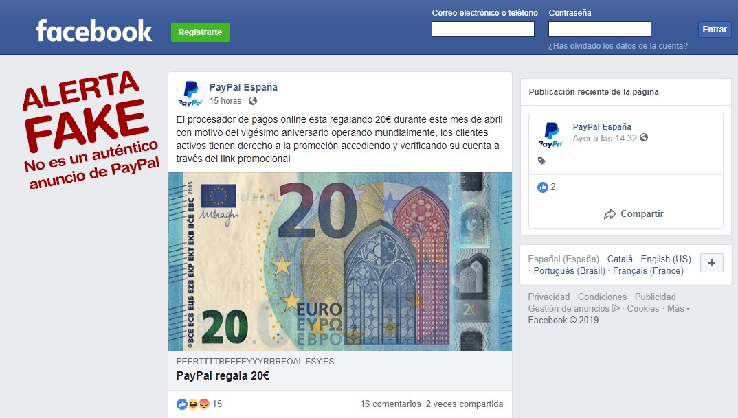 El anuncio simula proceder de una página oficial de PayPal que en realidad ha sido creada por los timadores hace solo unas horas y cuya URL es facebook.com/PayPal-España-405625166683700. «El procesador de pagos online esta regalando 20€ durante este mes de abril con motivo del vigésimo aniversario operando mundialmente, los clientes activos tienen derecho a la promoción accediendo y verificando su cuenta a través del link promocional», dice la publicidad.