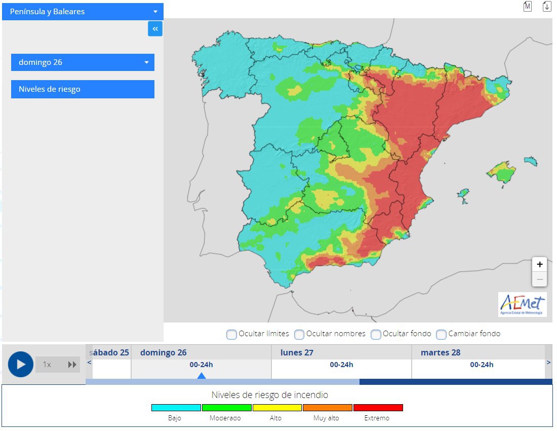 «Diversas zonas del país ya están en situación de riesgo alto a muy alto de incendios, pero el riesgo parece aumentar en los próximos días, podría llegar a ser extremo en amplias áreas del tercio E peninsular el viernes y especialmente el domingo», han detallado en sus redes sociales desde la Aemet, para tratar de sensibilizar a la ciudadanía sobre los riesgos.