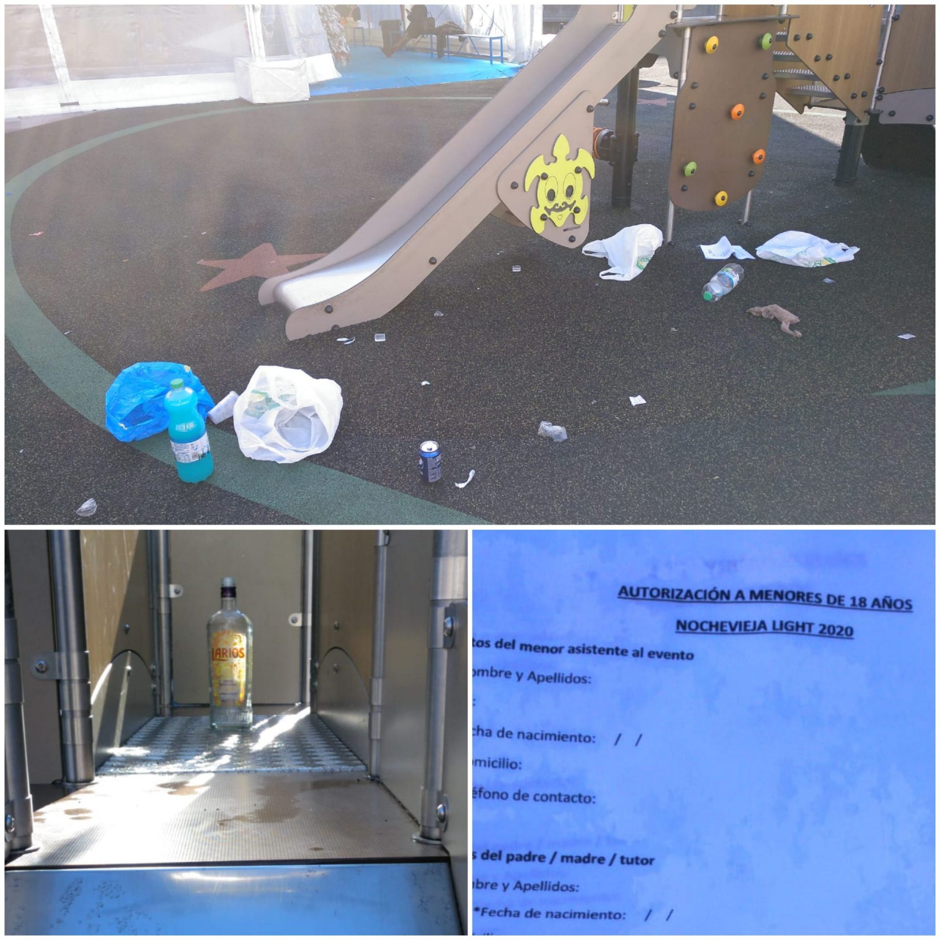 Un lector nos manda estas imágenes de los restos de botellón, esta mañana de Año Nuevo, en un parque infantil.