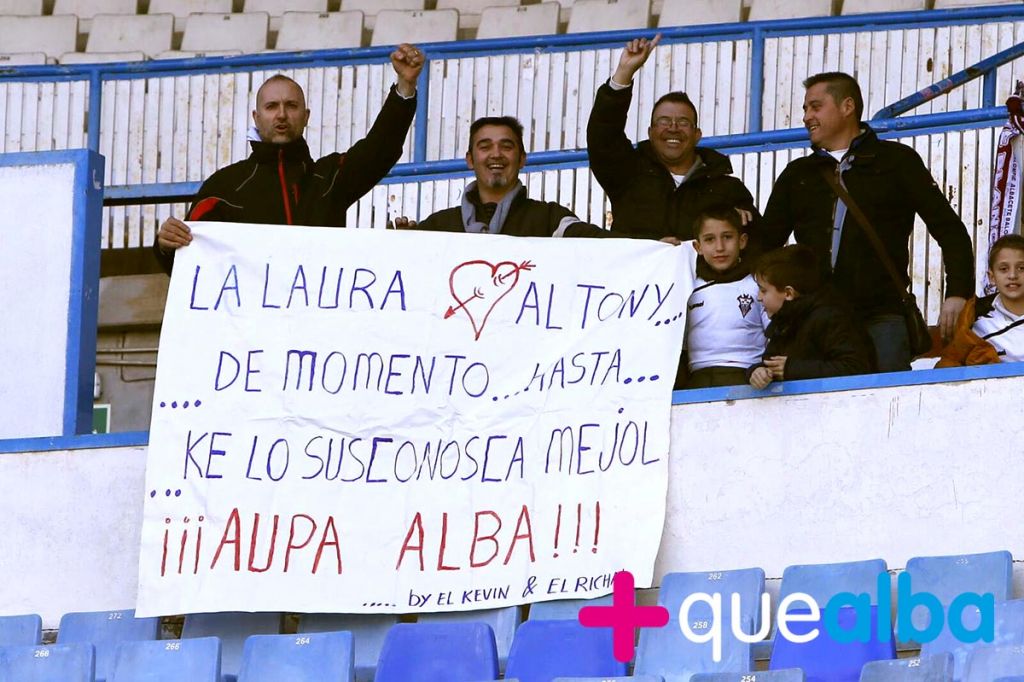 En las gradas de La Romareda hemos visto esta pancarta que conmemora el aniversario de Antonio Garijo y Laura, dos albaceteños que celebran esta efemérides en Zaragoza junto a otros amigos. El amor está presente en la grada. Por mucho que diga la pancarta que seguro que ella ya lo conoce bien y está encantada. Esperamos que lo celebren con una victoria del Albacete Balompié.