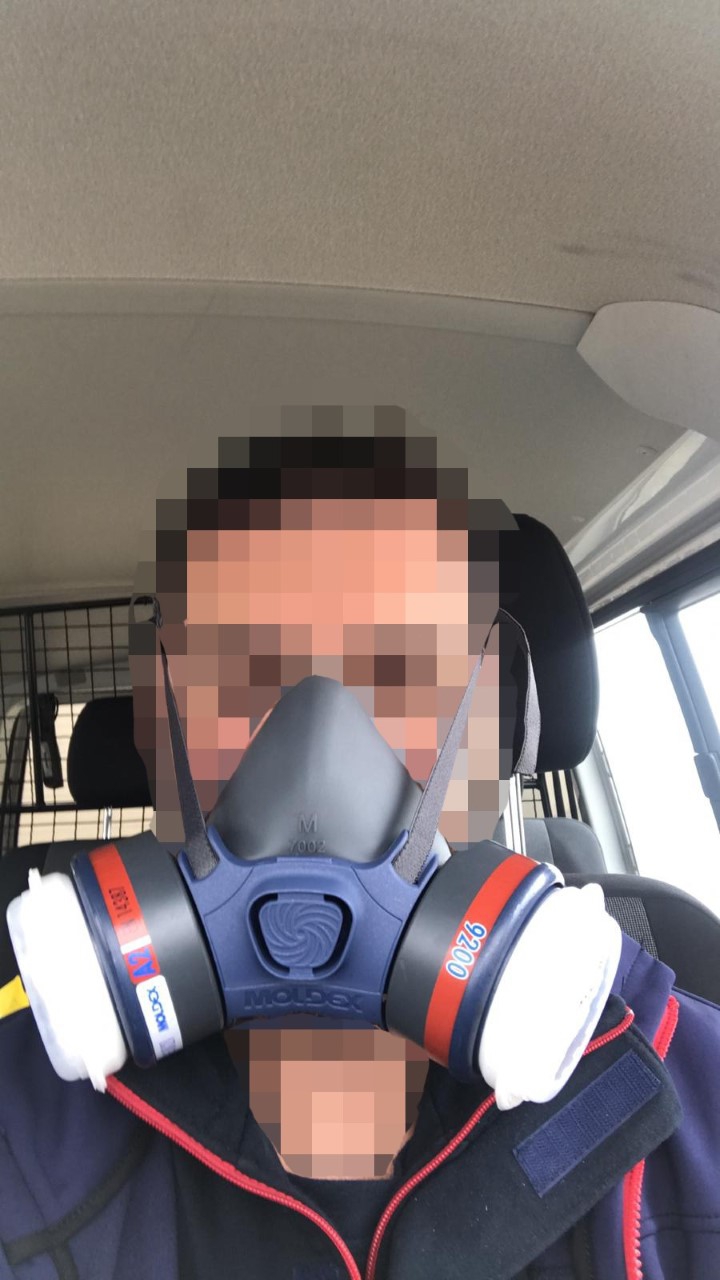 “Estas máscaras se utilizan para trabajos de reparación con riesgo de intoxicación grave; están diseñadas para tiempos cortos de uso y su tenerlas puestas mientras se conduce un vehículo impide la visión lateral, limita los movimientos de la cabeza. Pueden además incrementar los posibles daños en caso de accidente, debido al accionamiento del airbag, etcétera, etcétera.”