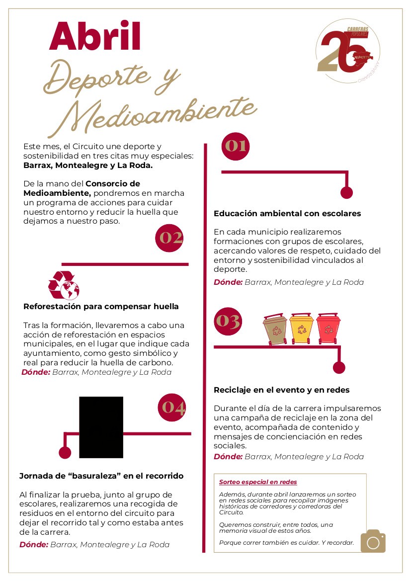 El XXV Circuito Provincial de Carreras Populares une deporte y sostenibilidad en tres citas muy especiales: La Roda, Montealegre del Castillo y Barrax, carreras que se celebrarán los sábados 11, 18 y 25, respectivamente. De la mano del Consorcio de Medioambiente, la Sección de Deportes de la Diputación de Albacete pone en marcha un programa de acciones para cuidar nuestro entorno y reducir la huella que dejamos a nuestro paso.