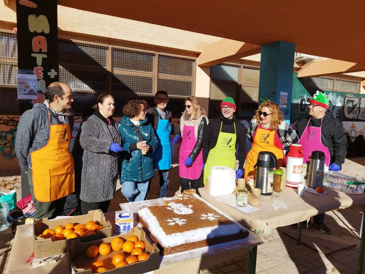 Detallan que «hemos querido aprovechar la celebración del último día del curso ,para ofrecer un almuerzo saludable y navideño, compartiendo con alumnado, padres, madres y profesorado dos grandes bizcochos de harina de tritordeum, elaborados artesanalmente por la reconocida Panadería Sahuquillo, acompañados de fruta de temporada e infusiones ecológicas».