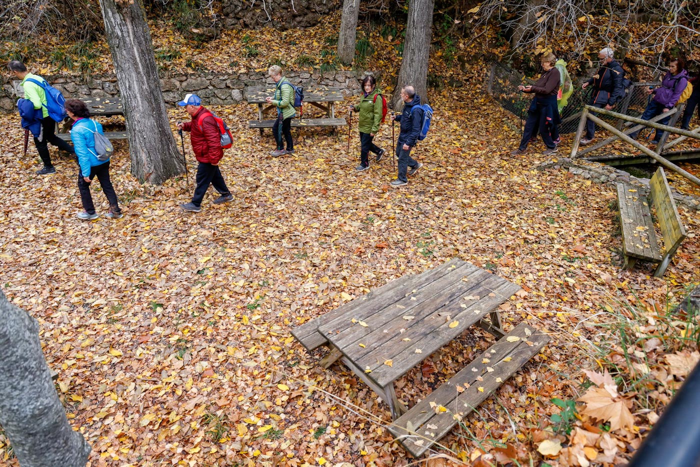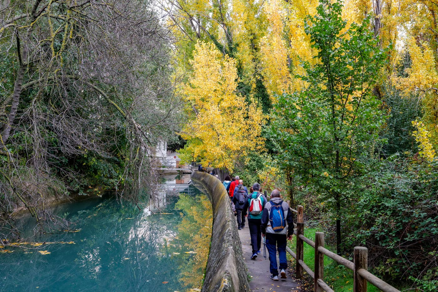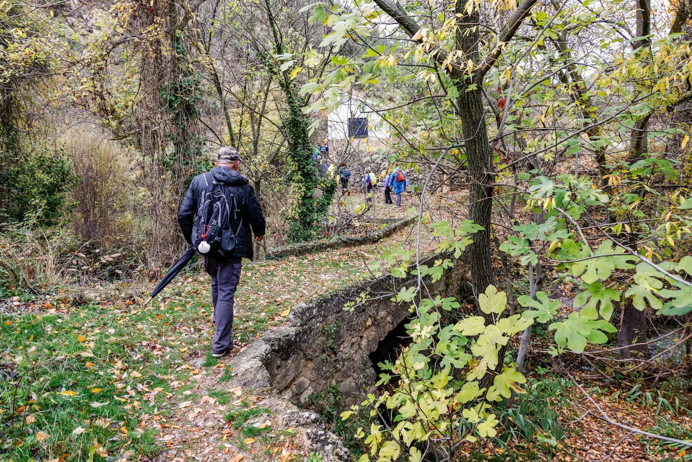 Cruzarían el puente romano, para coger a la derecha la preciosa senda del agua y así abandonar el municipio, en dirección a la “Senda del Batan”. Comenzarían ascendiendo hasta llegar al primer mirador, con una de las mejores vistas del municipio, más ahora con los colores del otoño, presidido por su castillo y la iglesia de san Andrés.