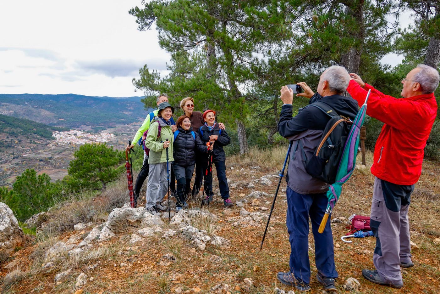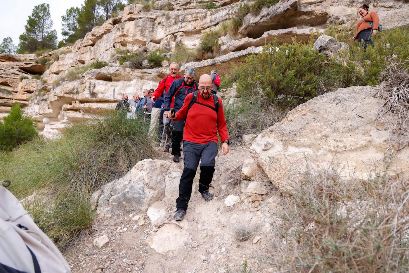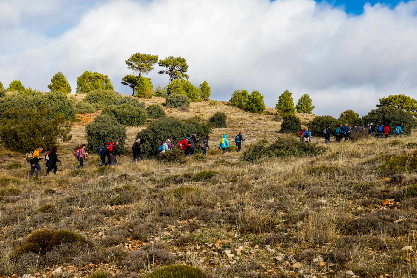 Avanzarían un tramo, ahora por pista y llaneando hasta enlazar con la “ceja” de la montaña, para iniciar el descenso por la “Senda del Bobo” hacia el Barranco de la Noguera. Llegarían así hasta el segundo de los miradores del recorrido, junto a la carretera que da acceso al municipio. Empezarían de nuevo a ascender por la técnica “Senda del Corciolico” en dirección a la pedanía de Casas del Cerro. Una vez allí, en la fantástica terraza del complejo Alkalea, con impresionantes vistas de Alcalá, disfrutaron de un contundente almuerzo, cortesía del Ayuntamiento del municipio.
