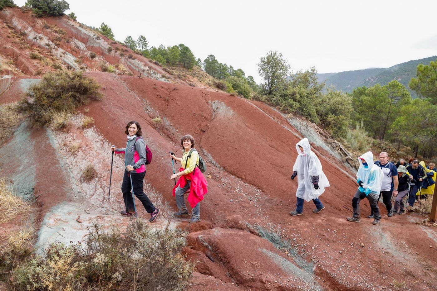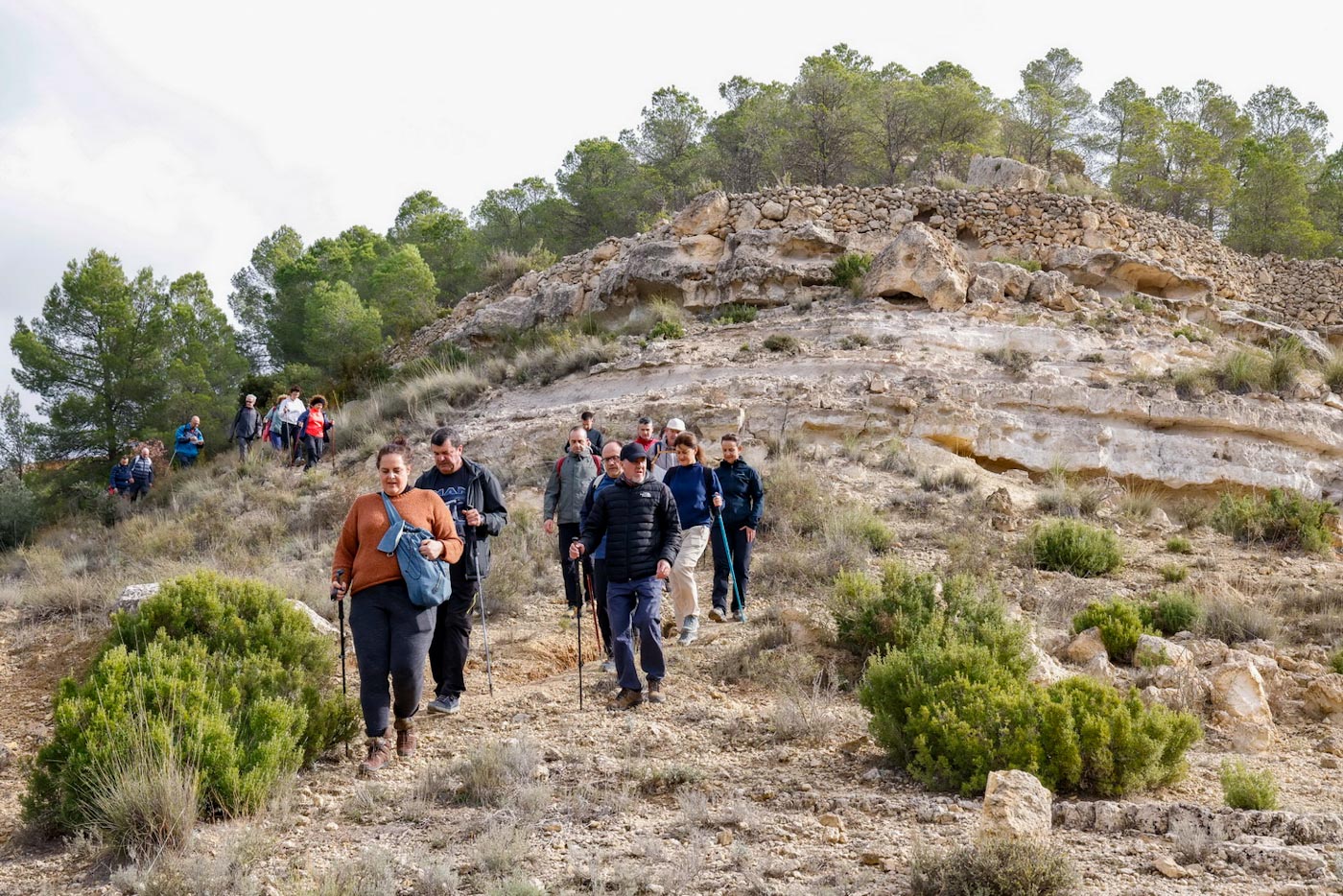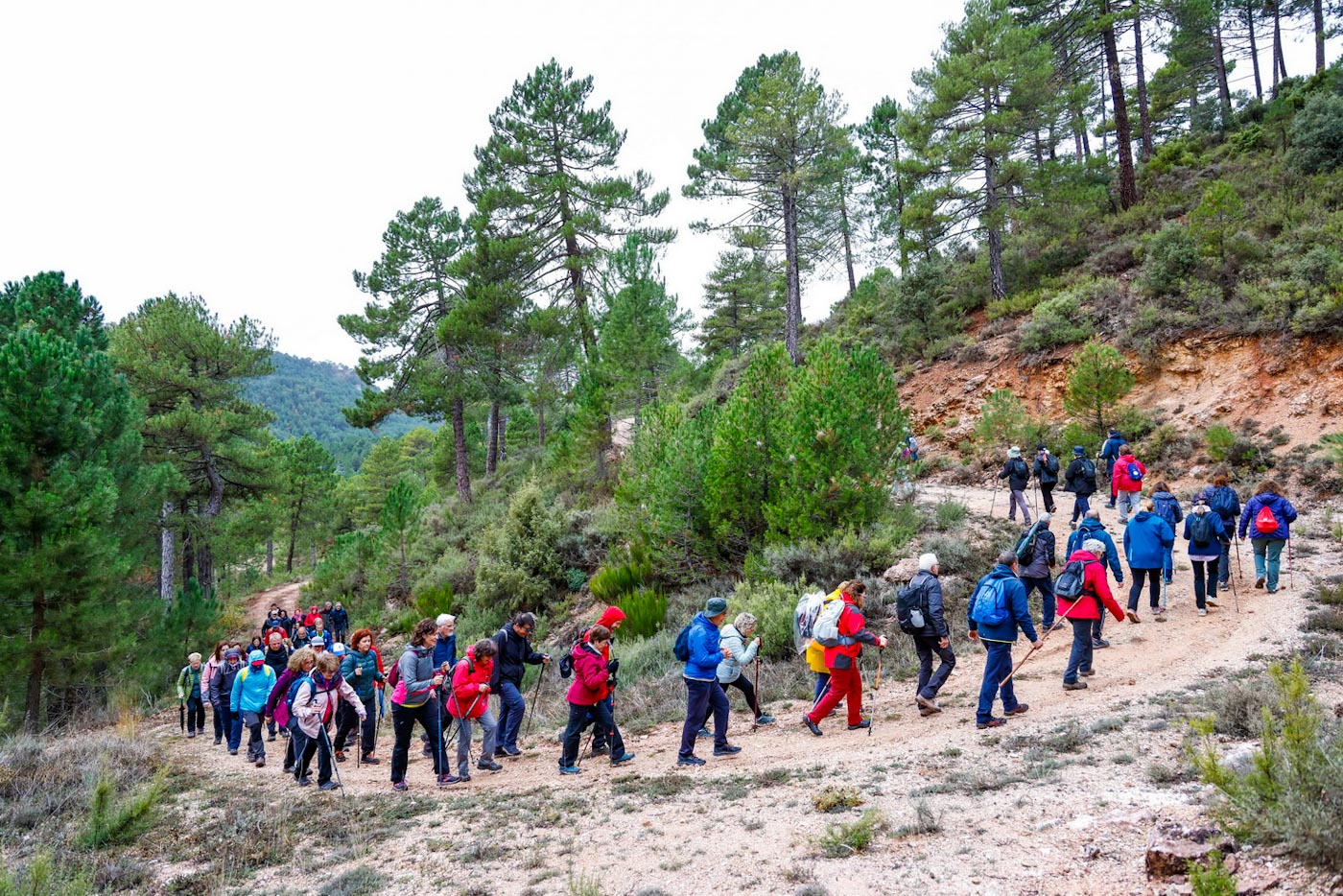 Avanzarían un tramo, ahora por pista y llaneando hasta enlazar con la “ceja” de la montaña, para iniciar el descenso por la “Senda del Bobo” hacia el Barranco de la Noguera. Llegarían así hasta el segundo de los miradores del recorrido, junto a la carretera que da acceso al municipio. Empezarían de nuevo a ascender por la técnica “Senda del Corciolico” en dirección a la pedanía de Casas del Cerro. Una vez allí, en la fantástica terraza del complejo Alkalea, con impresionantes vistas de Alcalá, disfrutaron de un contundente almuerzo, cortesía del Ayuntamiento del municipio.