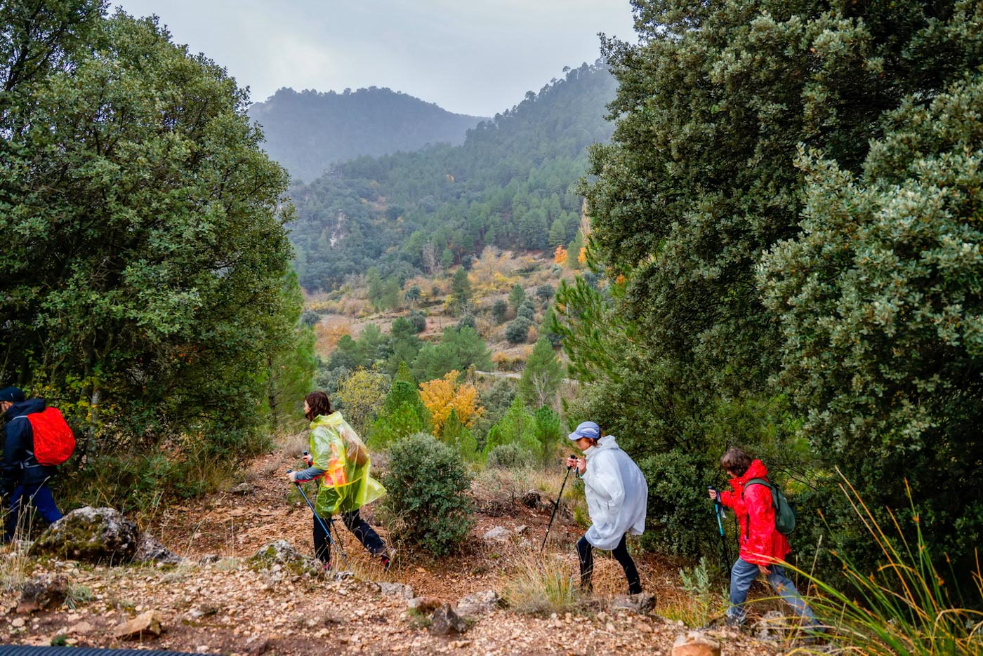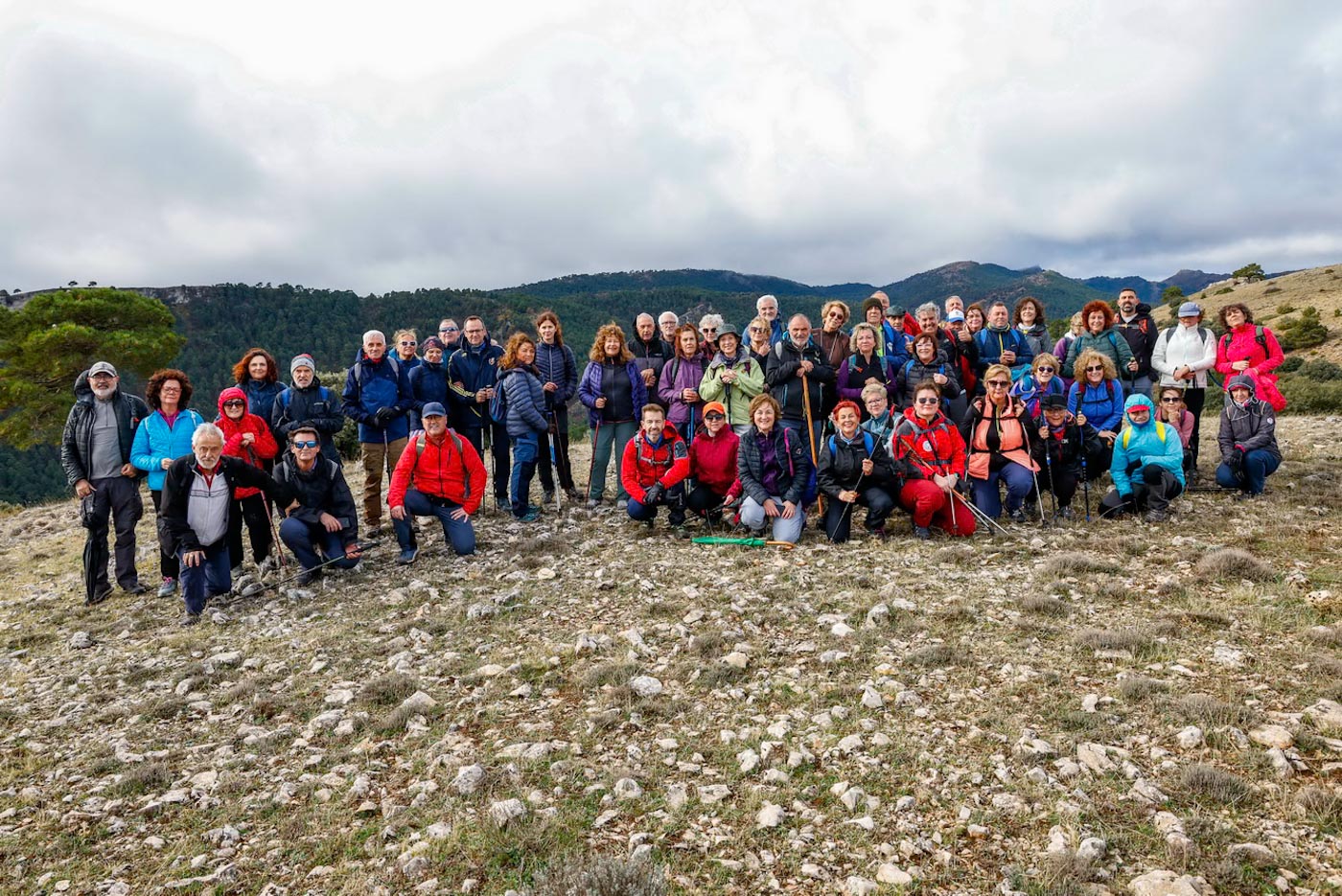 Con algo de frío y lluvia ligera arrancarían la marcha a pie, dejando la carretera que va hacia Riópar y tomando una senda en dirección al collado de la Espinera. Tras 660 metros, se desviarían por una pista forestal a la izquierda. Irían ascendiendo por esta pista un par de kilómetros, donde pudieron observar el valle del río de las Hoyas y el Calar de la Osera. La llovizna iba y venía, aunque no con intensidad, pasarían por el refugio de la Cabeza, antes de llegar al pico del mismo nombre, con impresionantes vistas. Desde aquí, a lo lejos, pudieron contemplar el pico Padrasto de su vecino pueblo de Bogarra, al igual que el pico de La Almenara.