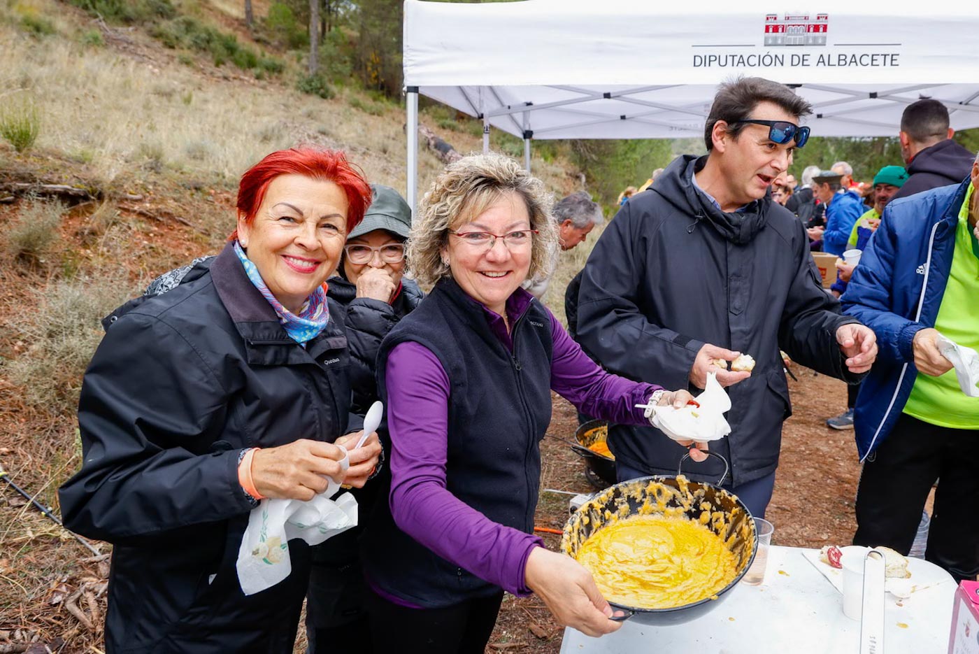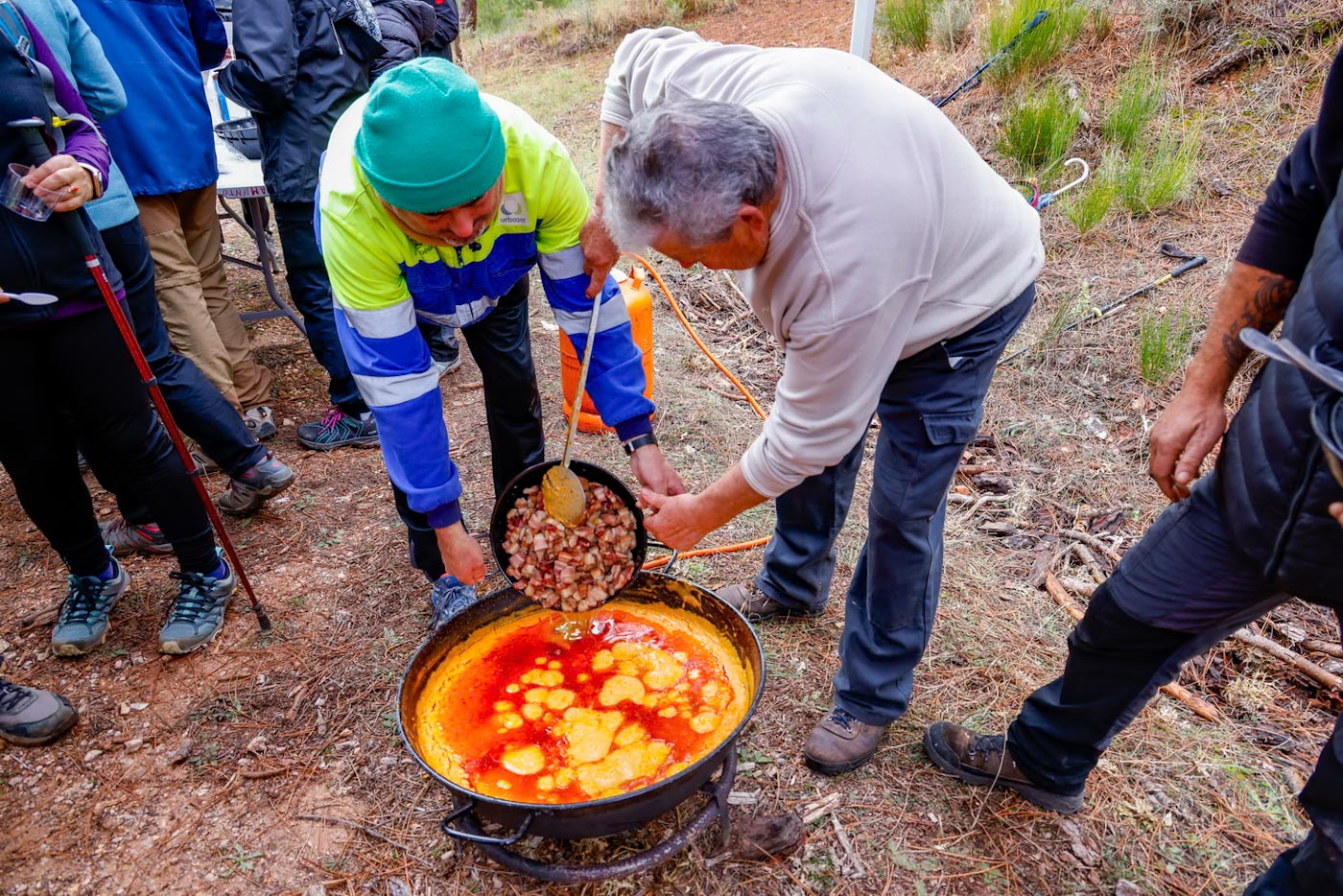 Tras recorrer unos tres kilómetros, abandonarían la pista para tomar entonces una senda a la derecha que desciende hacia una pradera, cruzándola en dirección noreste. Llegarían así al mirador de la Cabeza, con fantásticas panorámicas de Paterna del Madera y el valle donde está enclavado. Avanzarían entonces dirección noreste, ya en descenso hacia La Cruceta, un cruce con el PR AB-25. Aquí, por cortesía del Ayuntamiento, almorzaron unas ricas gachas.