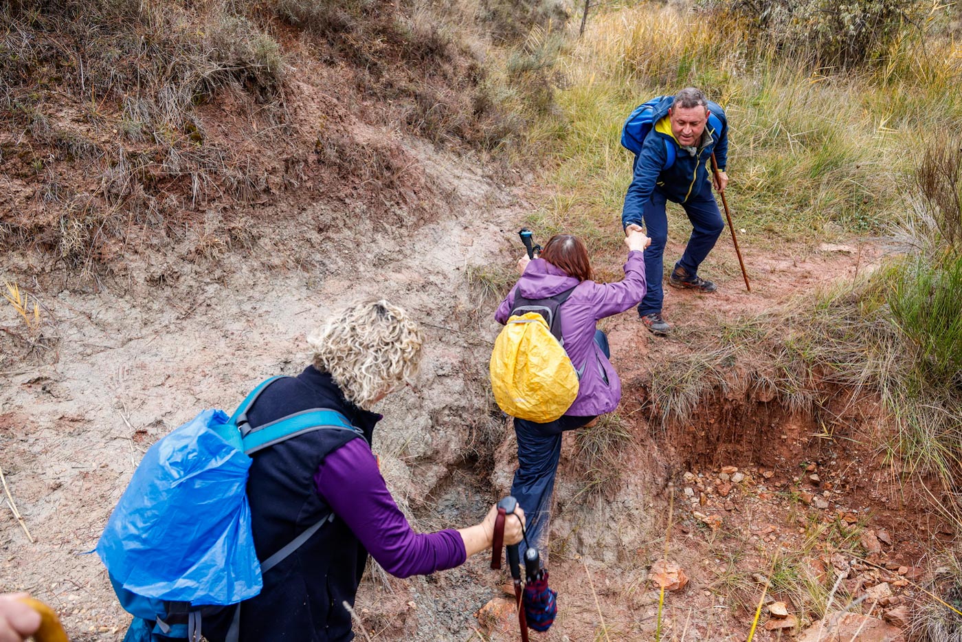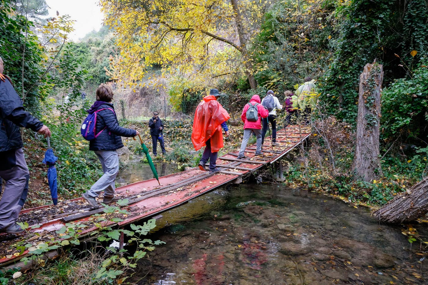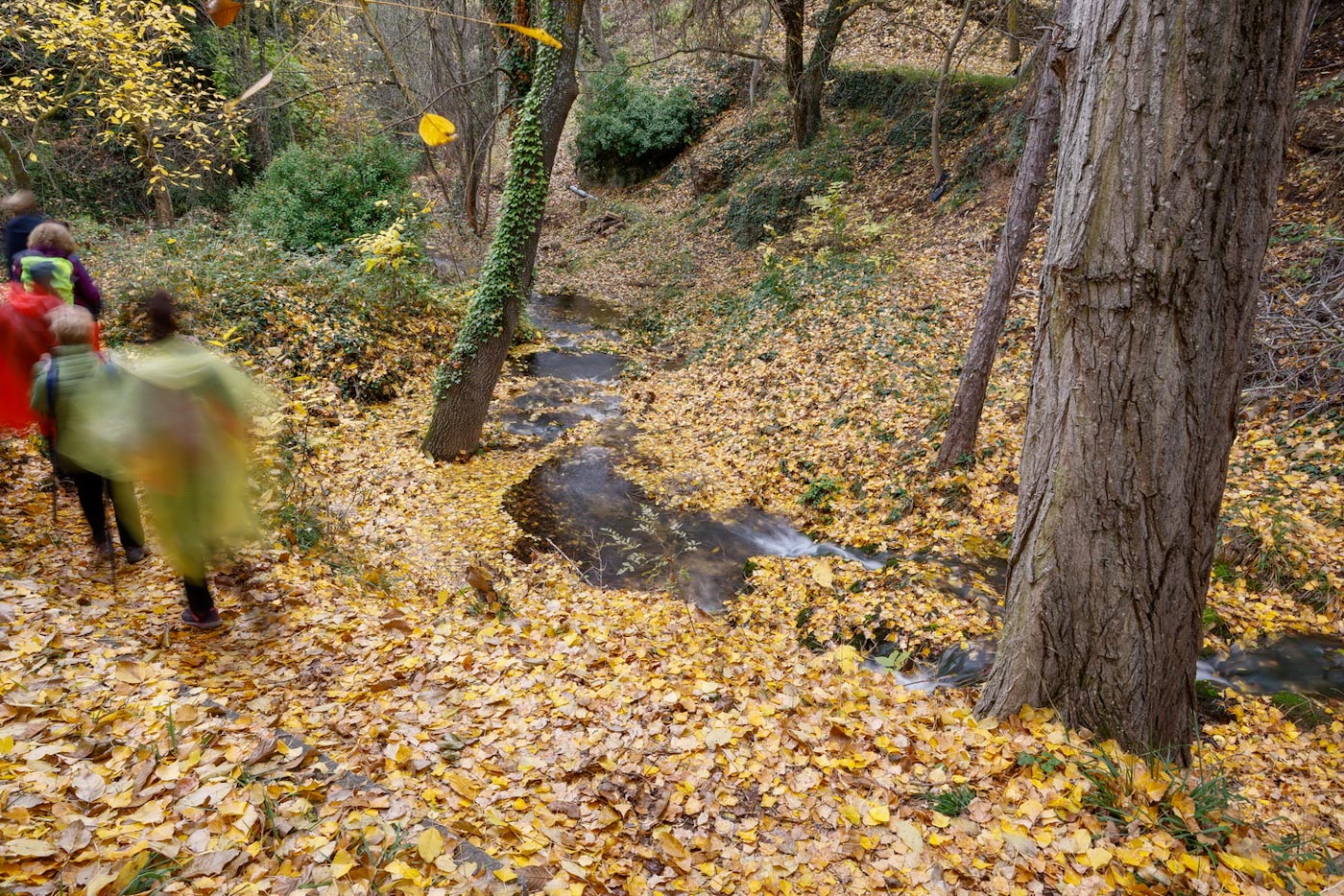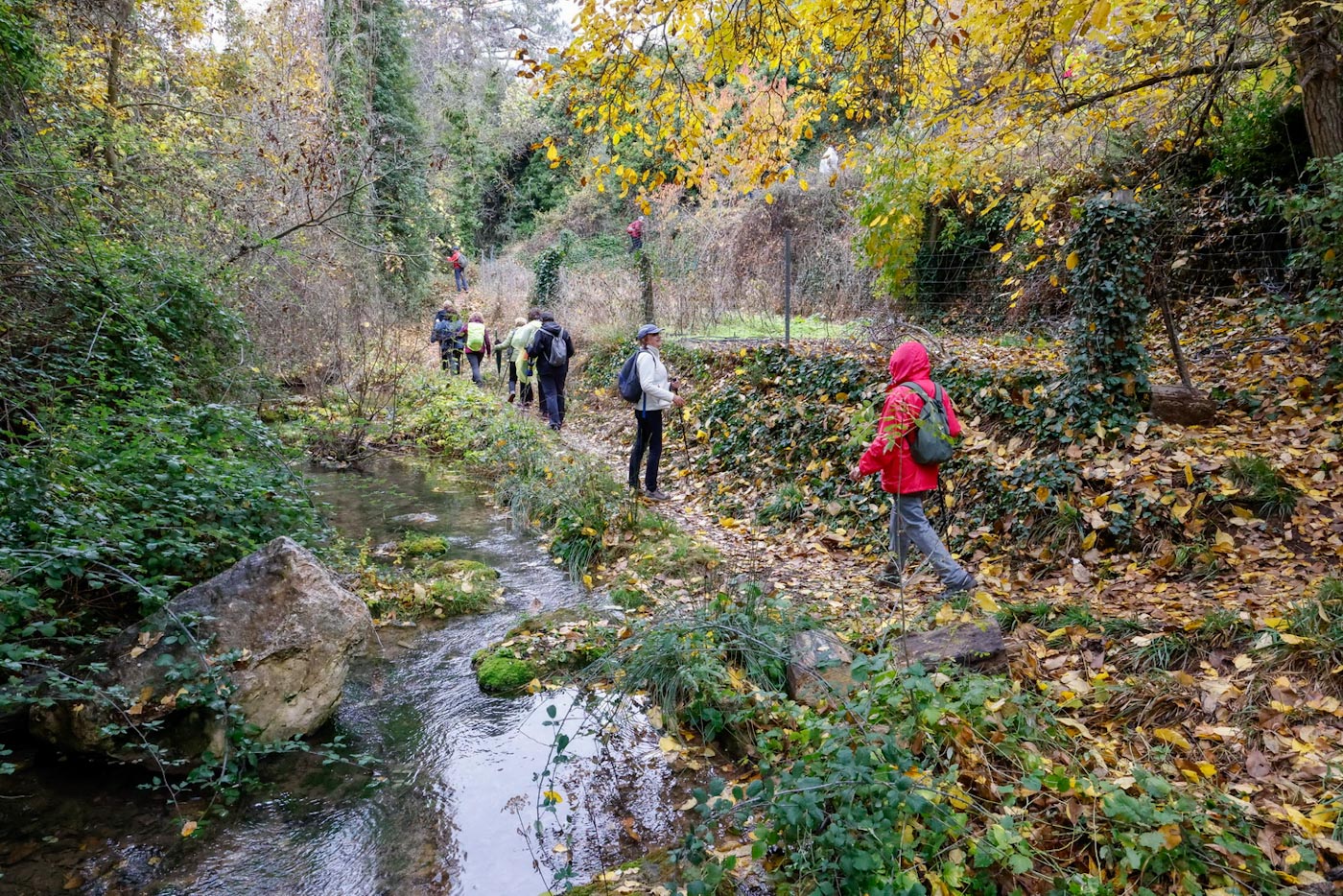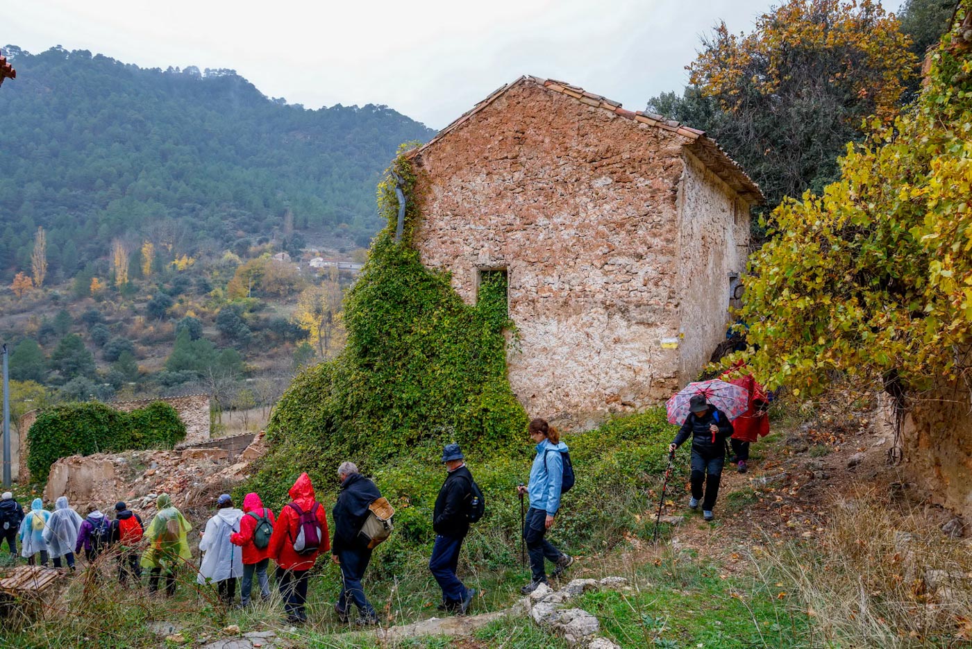 Empezaría entonces a llover con algo más de intensidad. Continuaron por senda para crestear por la Sierra de la Veracruz, disfrutando de una fantástica panorámica. Llegaron a una explanada con vistas al alto de Peñalta. Descenderían un poco entre almendros dirección a la a la Fuente del Quemao. Visitarían la pedanía del Batán del Puerto, que en esta época del año esta precioso, al igual que el entorno de Fuente Lisa, por donde pasaron, para luego enlazar con el camino antiguo del rio Madera, ya con unas vistas muy bonitas de Paterna y el valle con infinidad de chopos con sus hojas amarillas, hasta llegar finalmente al camino que conecta con el PR AB-26, para entrar de nuevo al municipio y concluir la ruta.