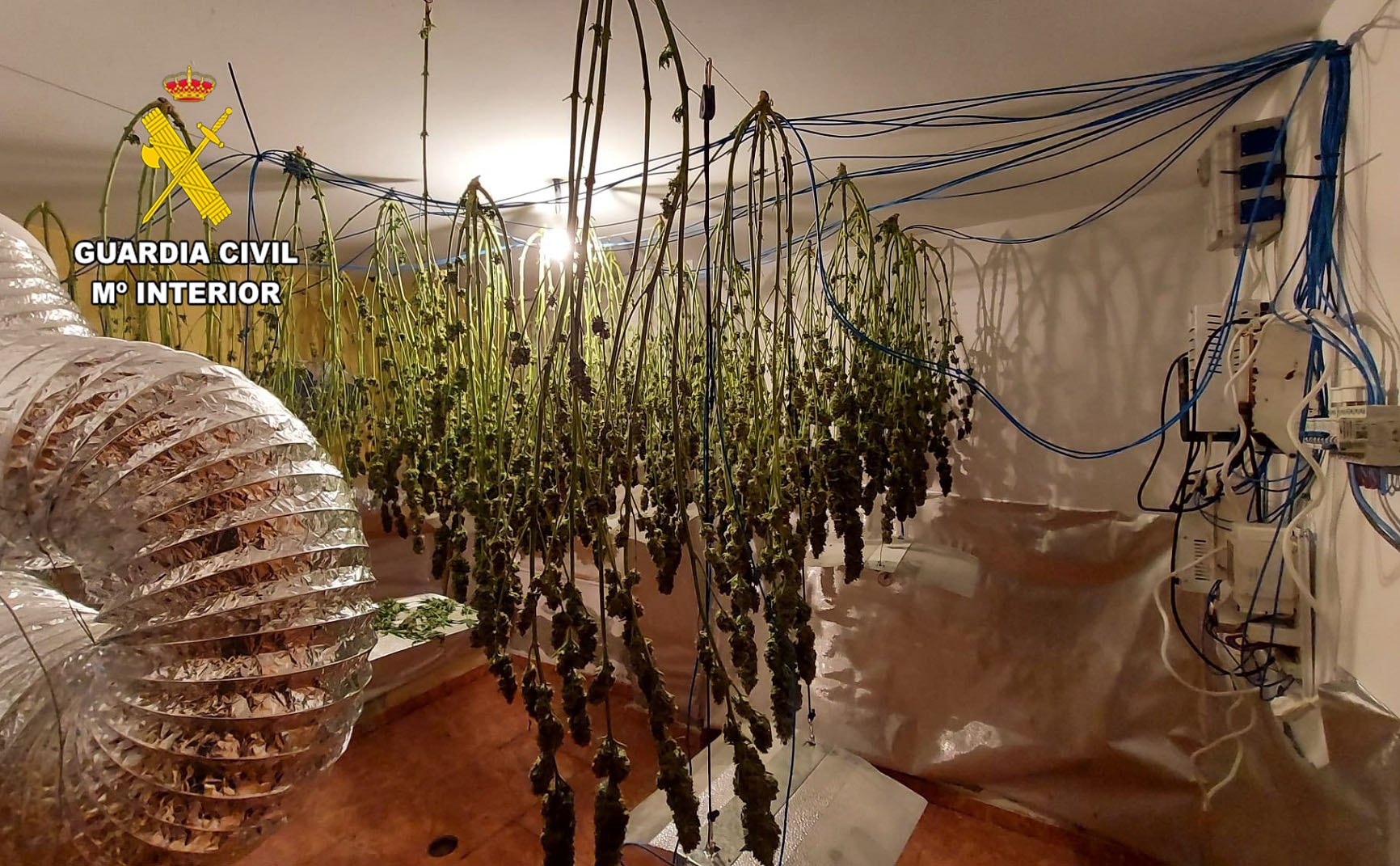 Constatadas las sospechas y contando con la pertinente autorización judicial, la Guardia Civil realizó el registro en la casa de campo objeto de las investigaciones, localizando en su interior cuatro habitaciones, preparadas expresamente para el cultivo indoor de marihuana, contando todas ellas con todos los elementos necesarios para completar sus distintas fases de crecimiento; pudiendo comprobar que la citada plantación era alimentada con un enganche ilegal de fluido eléctrico.