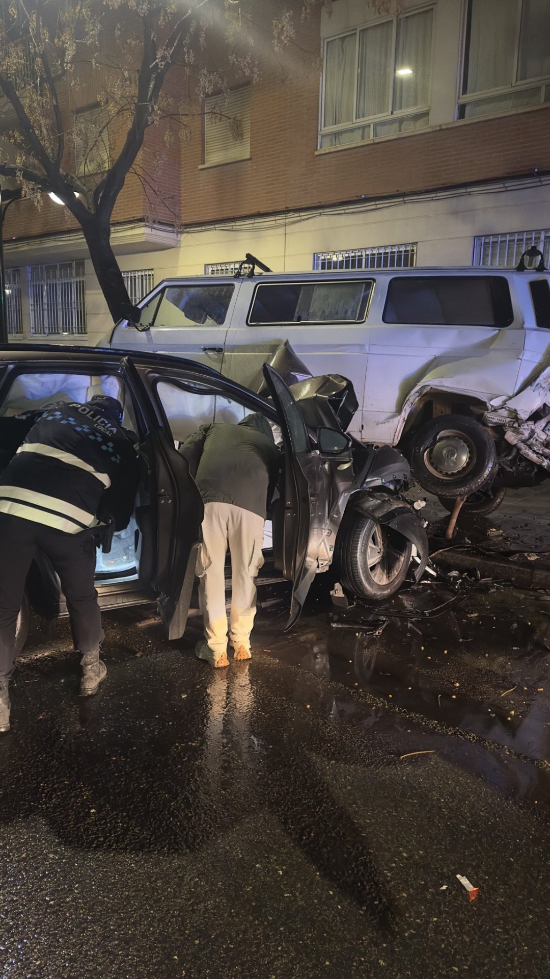 Un conductor fue detenido por un delito contra la seguridad vial tras circular bajo los efectos del alcohol y provocar un accidente esta madrugada, en la calle La Roda, con importantes destrozos en vehículos aparcados.