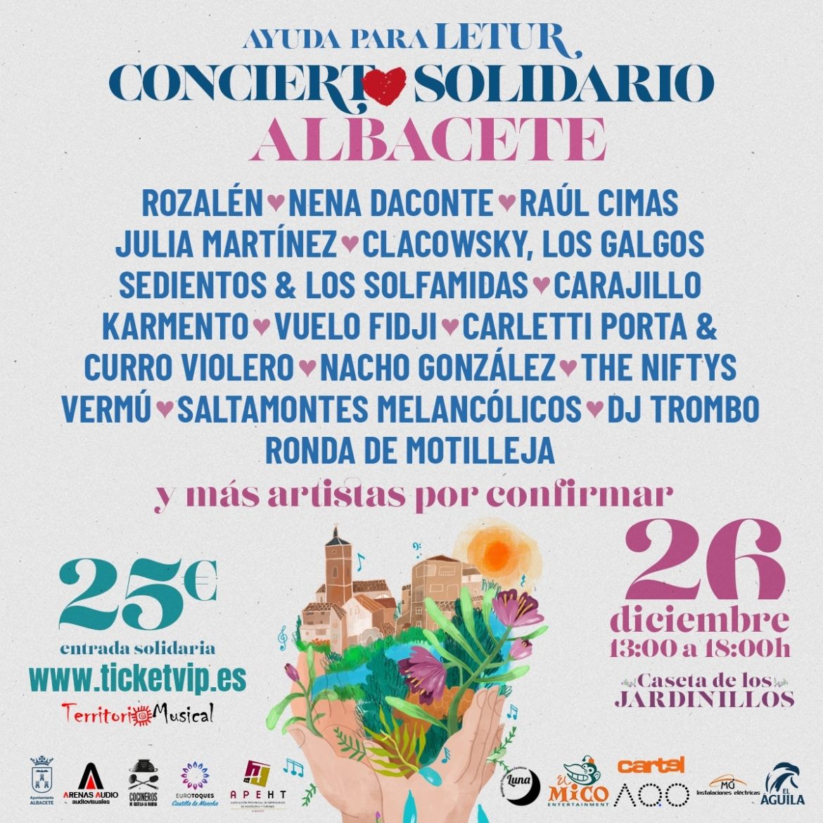 Rozalén encabeza un extraordinario elenco de artistas y grupos nacionales y locales que se han querido sumar a este evento “100% benéfico” que se celebrará el próximo jueves, 26 de diciembre, en Albacete. Será la Caseta de los Jardinillos, desde las 13.00h y hasta las 18.00h, la que acoja este festival que destinará toda su recaudación a ayudar en la reconstrucción de Letur tras el paso de la DANA, del pasado 29 de octubre. ROZALÉN, NENA DACONTE, RAÚL CIMAS, KARMENTO, ETC. Rozalén, Nena Daconte, Raúl Cimas, Julia Martínez, Clacovsky y los Galgos Sedientos y los Solfamidas, Carajillo, Karmento, Vuelo Fidji, Carletti Porta & Curro Violero, Nacho González, The Niftys, Vermú, Saltamontes Melancólicos, DJ Trombo y la Ronda de Motilleja conforman un cartelazo solidario al que se sumarán más artistas en los próximos días.