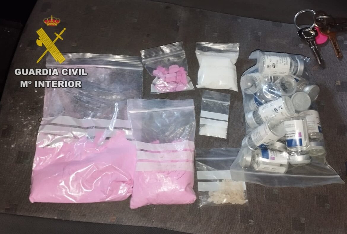 Los guardias civiles que participaban en el dispositivo, tras identificar a su único ocupante y observar cierto nerviosismo en él, procedieron al registro del vehículo y de sus enseres personales, localizando en un compartimento oculto de la guantera del turismo 93 gramos de lo que se conoce como cocaína rosa, 25 gramos de ketamina en polvo, 15 frascos inyectables también de ketamina, 21 unidades de MDMA (éxtasis) y 2 gramos de metanfetamina (cristal)