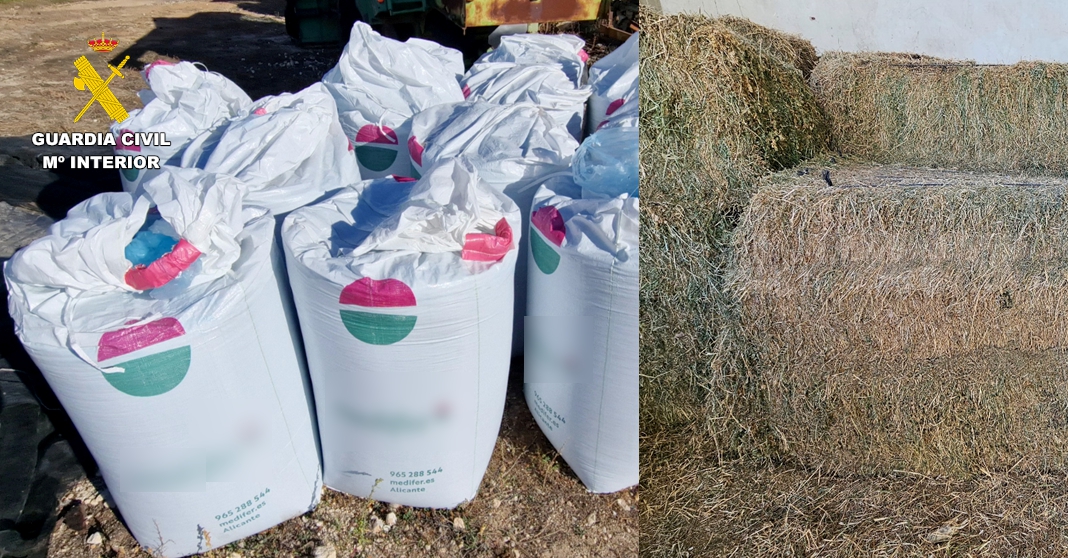 Se han recuperado, en una pedanía de Peñas de San Pedro, 12 pacas de alfalfa con un peso total de 6.000 kilos, así como 14 sacas de abono de nitrato que arrojaron un peso de 8.400 kilos, motivo por el cual ha sido investigada una persona por un delito de receptación.