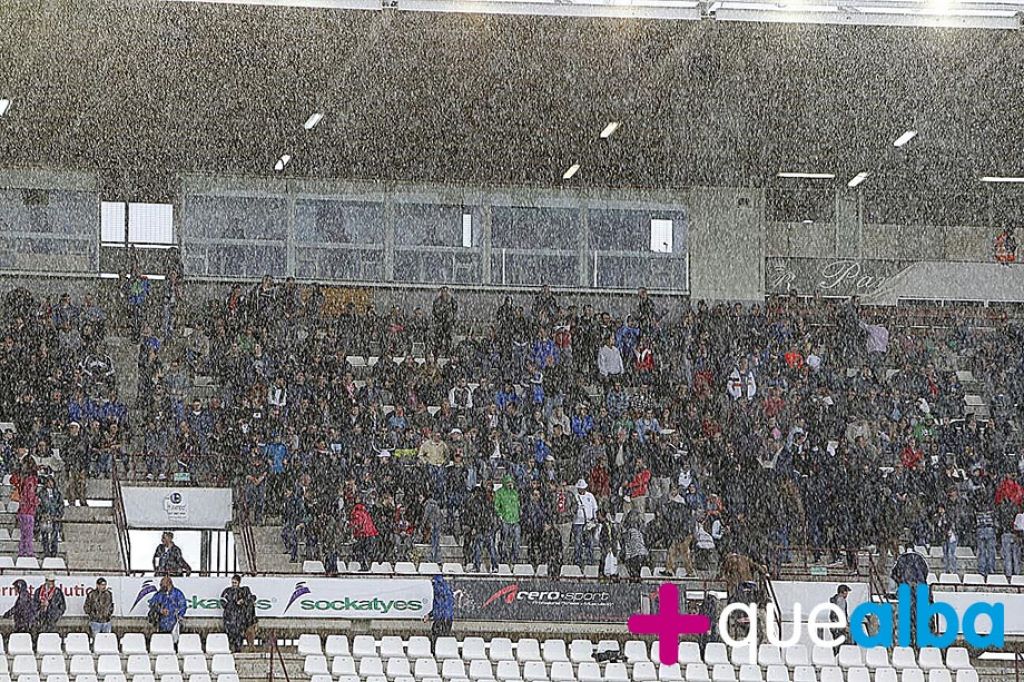Al descanso del Alba-Girona se puso a diluviar en el Carlos Belmonte. La afición tuvo que buscar refugio en el estadio, aunque a medida que el Girona seguía marcando los aficionados iban dejando cada vez en mayor número el estadio. Tarde de perros en un Belmonte que acabó desesperado de jugar contra 13, ya que el árbitro y la suerte estuvieron de lado del Girona.