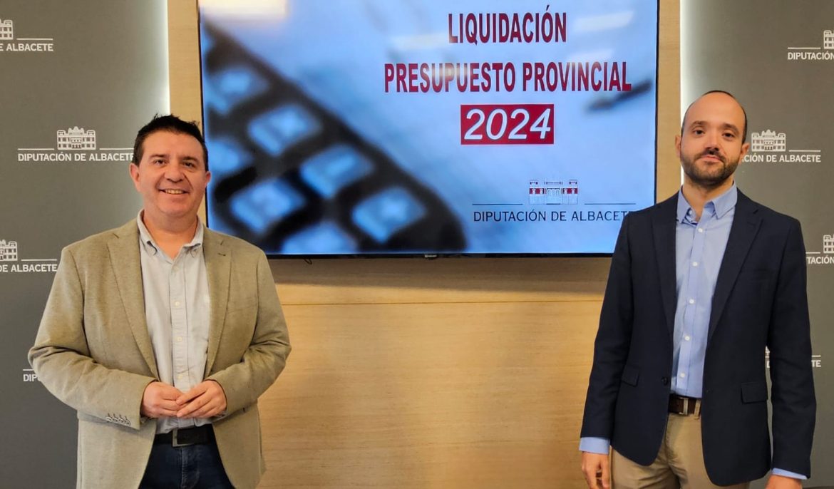 El presidente de la Diputación de Albacete, Santi Cabañero, acompañado del vicepresidente y responsable del Área Económica, Fran Valera, ha presentado este viernes en rueda de prensa la liquidación del presupuesto 2024 de la institución provincial.