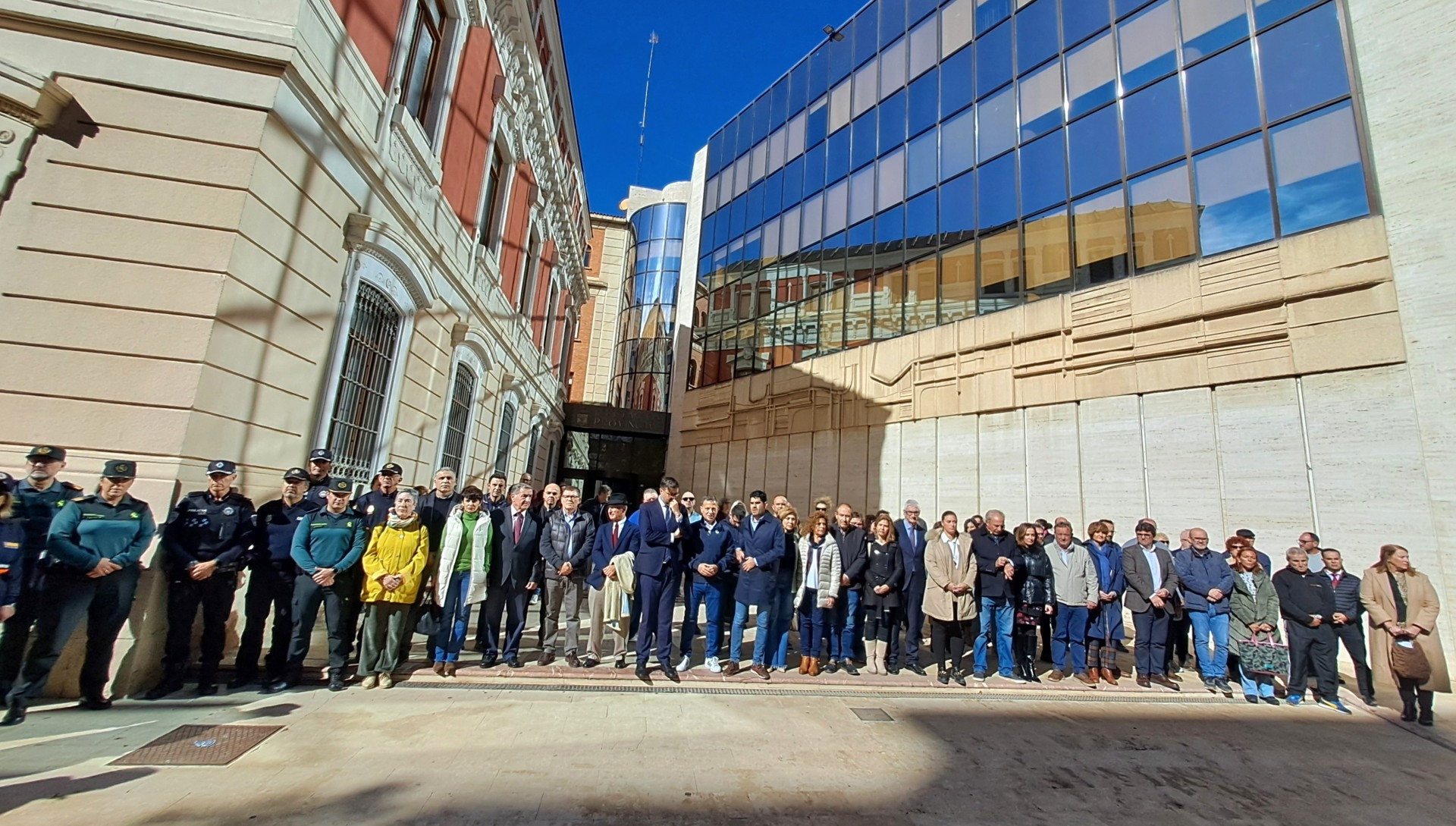 El diputado provincial del Área Social, José González, en nombre del presidente de la institución, Santi Cabañero, que se encuentra en Letur coordinando el apoyo de la institución a esta localidad; el alcalde de la ciudad, Manuel Serrano; y el consejero de Educación, Cultura y Deportes, Amador Pastor, junto a autoridades civiles y militares y representantes del tejido social, se han concentrado este medio día a las puertas del Palacio Provincial