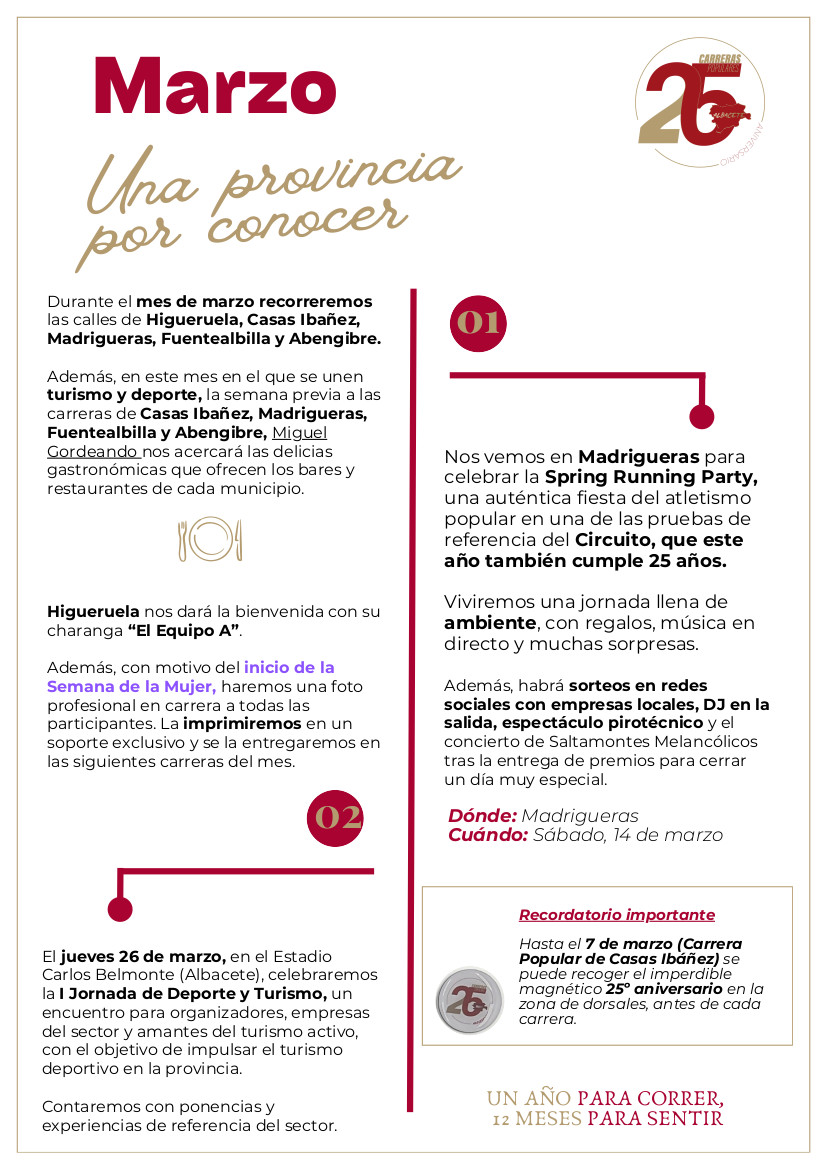 Por último, hay que recordar que hasta el 7 de marzo (Carrera Popular de Casas Ibáñez) los atletas inscritos al Circuito Provincial pueden recoger el imperdible magnético del 25º Aniversario en la zona de dorsales, antes del inicio de cada prueba.