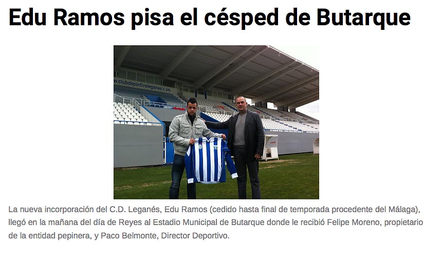 “La nueva incorporación del C.D. Leganés, Edu Ramos (cedido hasta final de temporada procedente del Málaga), llegó en la mañana del día de Reyes al Estadio Municipal de Butarque donde le recibió Felipe Moreno, propietario de la entidad pepinera, y Paco Belmonte, Director Deportivo”, así informaba la web del Leganés del fichaje de Edu Ramos, hace unos años, cuando el joven tenía entonces 18 años. Esta es la imagen que todavía sigue en la web del Leganés.