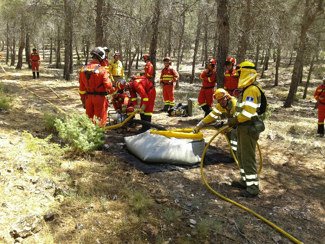 Agentes medioambientales y técnicos de la Junta de Castilla-La Mancha adscritos al Plan INFOCAM realizaron esta semana, junto a personal y medios de la Unidad Militar de Emergencias (UME), en Ayna (Albacete), unas prácticas conjuntas de tendido de manguera en caso de incendios forestales.