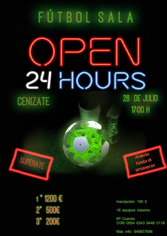 La localidad de Cenizate acogerá el próximo 26 de julio un torneo de Fútbol Sala 24 horas, con un premio de 1.200 euros para el equipo ganador y remuneración económica también para el segundo y tercer clasificado. Si tienes un equipo de Fútbol Sala, ya sabes dónde tienes una nueva cita en este mes de julio.
