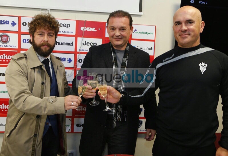 El presidente del Alba, José Miguel Garrido, el míster, Luis César, y el secretario técnico, Víctor Moreno, han brindado hoy con los medios de comunicación, tras una rueda de prensa sobre la renovación de Luis César y Víctor Moreno. Han deseado que 2016 traiga los mejores resultados al club.
