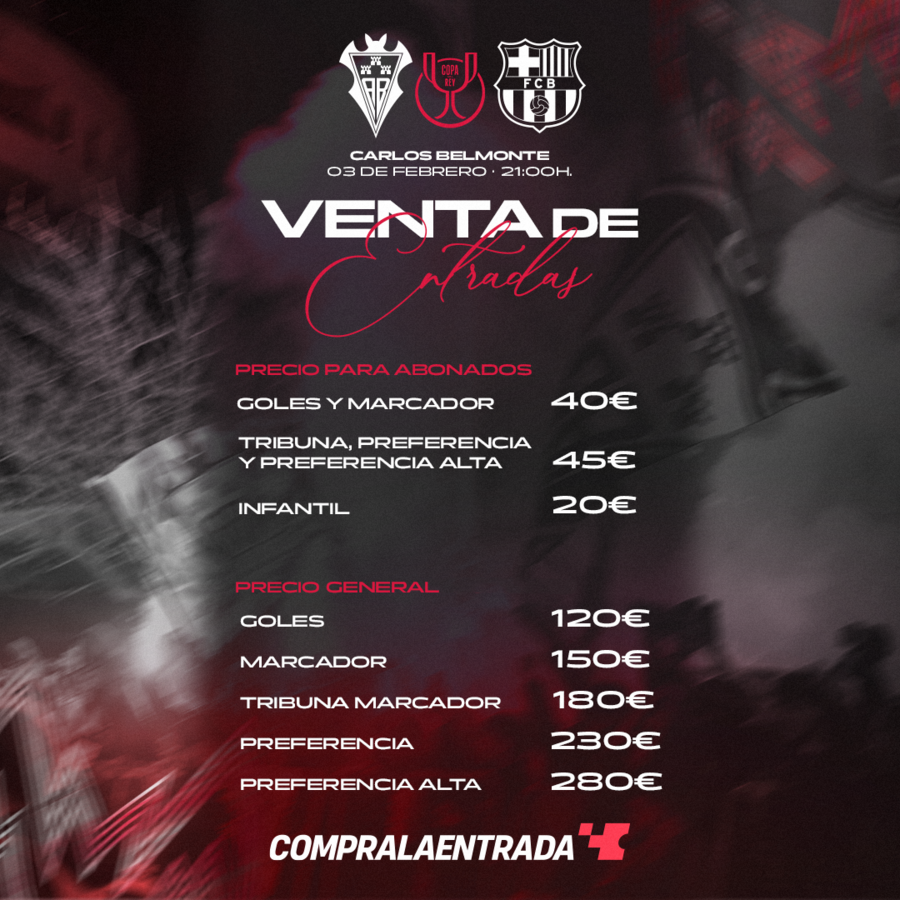 El Albacete Balompié desea comunicar el proceso de venta de las entradas correspondientes al partido de cuartos de final de Copa del Rey que nos enfrentará al FC Barcelona el próximo martes 3 de enero a las 21 horas.