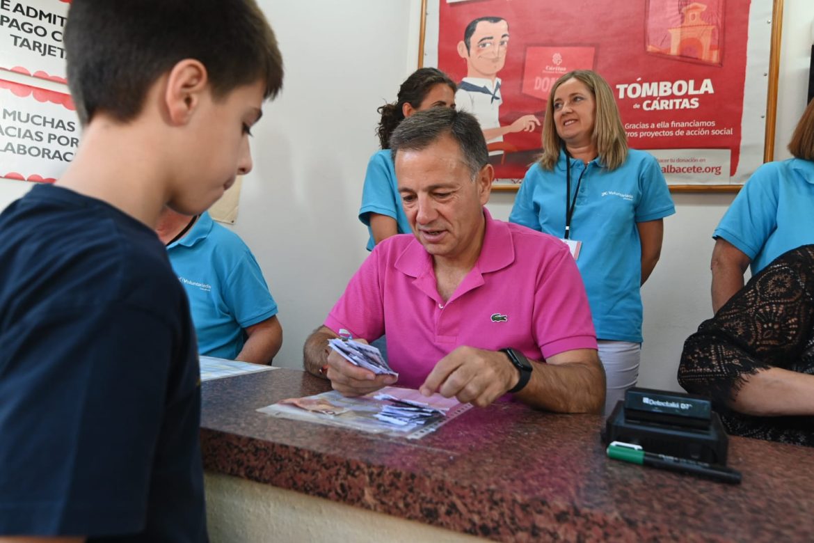 El alcalde de Albacete, Manuel Serrano, ha querido colaborar con la Tómbola de Cáritas y compartir la experiencia con los voluntarios y trabajadores de esta iniciativa ferial y solidaria, por lo que se ha sentado durante un espacio de tiempo a vender boletos como un voluntario más.