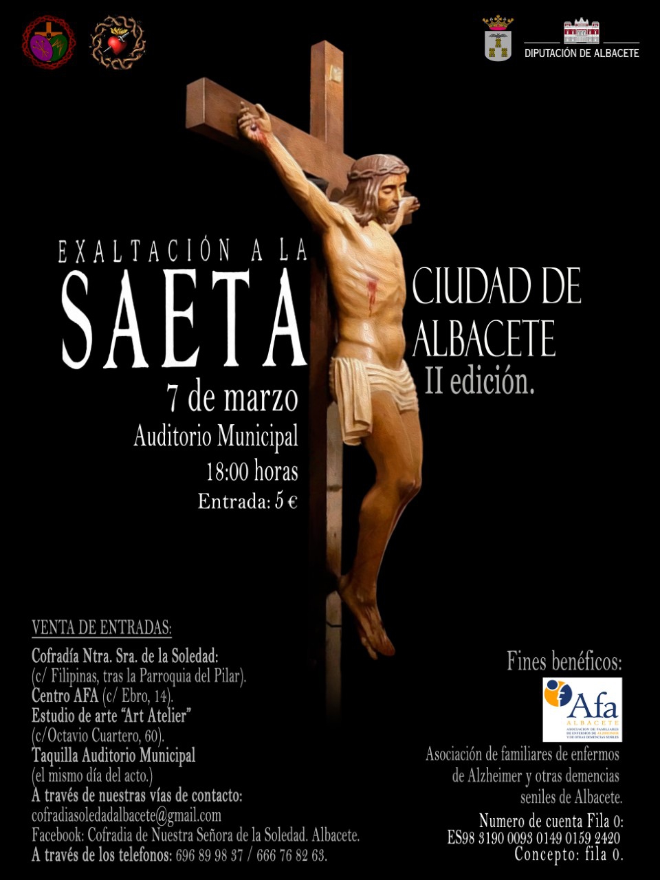 Esta segunda edición de este concurso de saetas se celebra a beneficio de la Asociación de Familiares y Enfermos de Alzheimer y otras Demencias de Albacete (AFA), que tiene entre sus proyectos más inminentes la construcción de un nuevo centro para atender a las personas aquejadas por estas patologías. La entrada a este evento se ha fijado en 5 euros y las mismas podrán adquirirse mañana en la taquilla del Auditorio Municipal, por aquellos que no la hayan comprado anticipadamente en la Cofradía o los establecimientos colaboradores. Además, se ha establecido una Fila Cero, es decir, un número de cuenta para que recaudar donativos para esta asociación (ES98 3190 0093 0149 0159 2420).