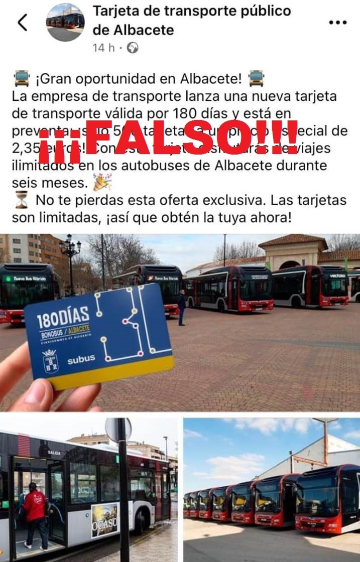 El Ayuntamiento quiere advertir a los ciudadanos de una estafa que está circulando por las redes sociales y, más concretamente por Facebook, sobre un falso Bono de 180 días lanzado por la empresa adjudicataria del transporte público urbano, Vectalia, para disfrutar de viajes ilimitados por 6 meses que se puede adquirir por preventa, para que sepan que esta información es totalmente falta y que, por tanto, no deben adquirir estos títulos.