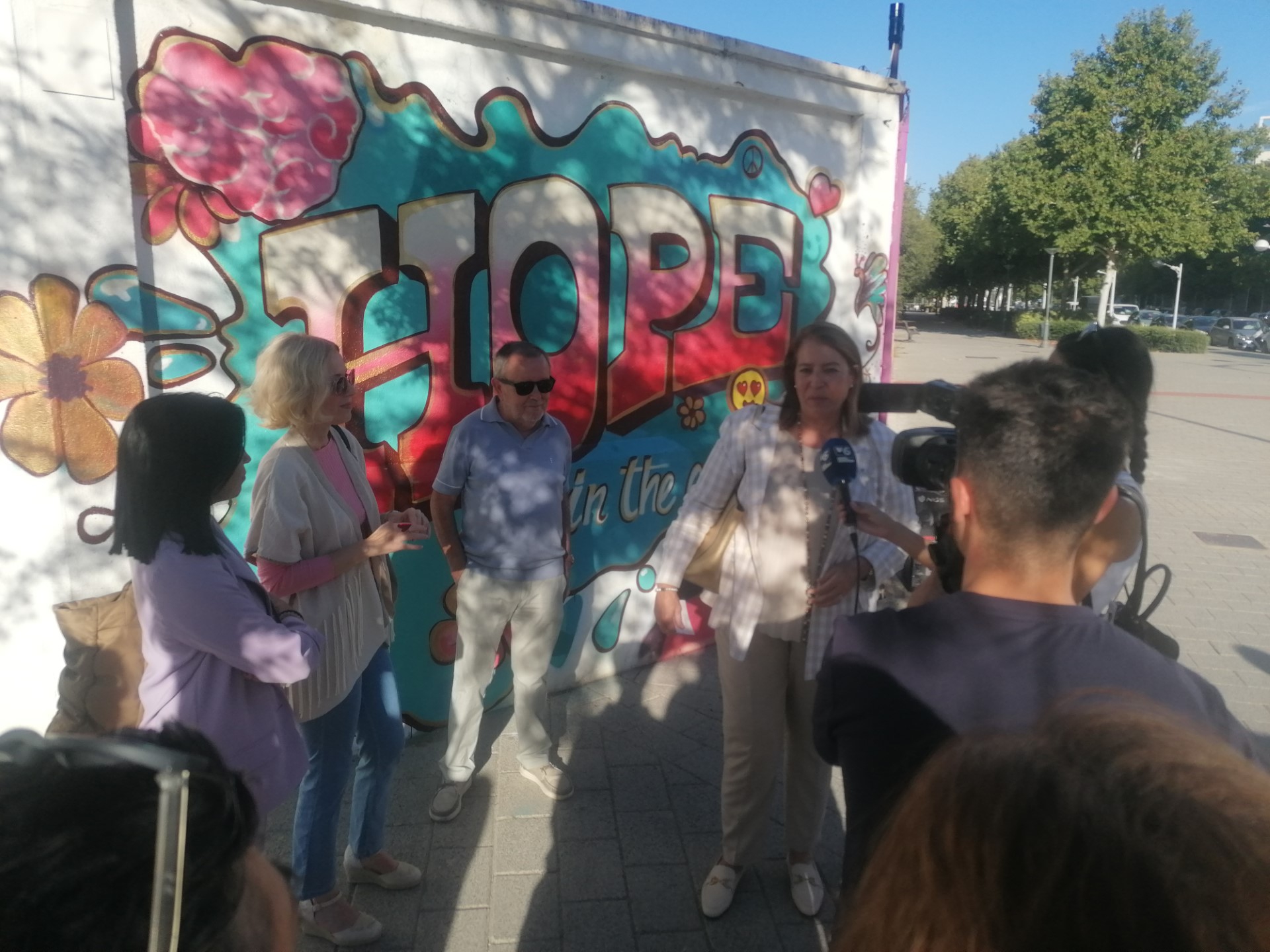 Las concejalas de Asuntos Sociales y de Personas e Igualdad, Llanos Navarro y Gala de la Calzada, han asistido a la inauguración de un nuevo grafiti elaborado con motivo del Día de la Salud Mental, dentro de la campaña “La esperanza está en el aire” del Teléfono de la Esperanza para la prevención del suicidio, centrada este año en la población joven. El grafiti se ha realizado en una de las paredes de las piscinas municipales del Paseo de la Cuba