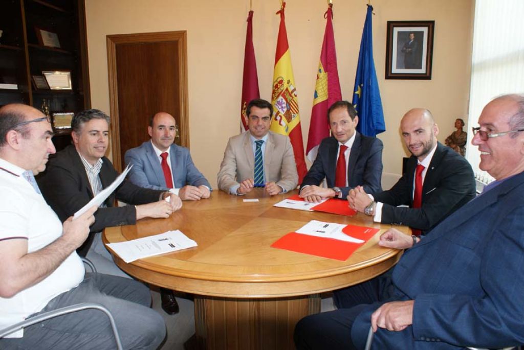 El alcalde de Albacete ha firmado el préstamo con Santos Sanz Oleo, director territorial del Banco Santander en Castilla-La Mancha, en presencia de Carlos Macho, director de Oficina de Empresas de la entidad financiera en Albacete, y Rubén Alejandro Marco, responsable territorial de Instituciones del Banco, así como del concejal de Obras Públicas e Infraestructuras, Julián Garijo.