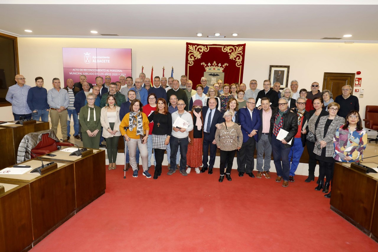 El alcalde de Albacete, Emilio Sáez, ha presidido el homenaje a los trabajadores y trabajadoras del Ayuntamiento que se han jubilado en los años 2020 y 2021. Un emotivo acto que no se ha podido celebrar en los últimos dos años y que “era una deuda pendiente con todas estas personas que durante buena parte de su vida se han dedicado a servir a la ciudadanía y han contribuido a construir Albacete como hoy la conocemos”, ha señalado Emilio Sáez.