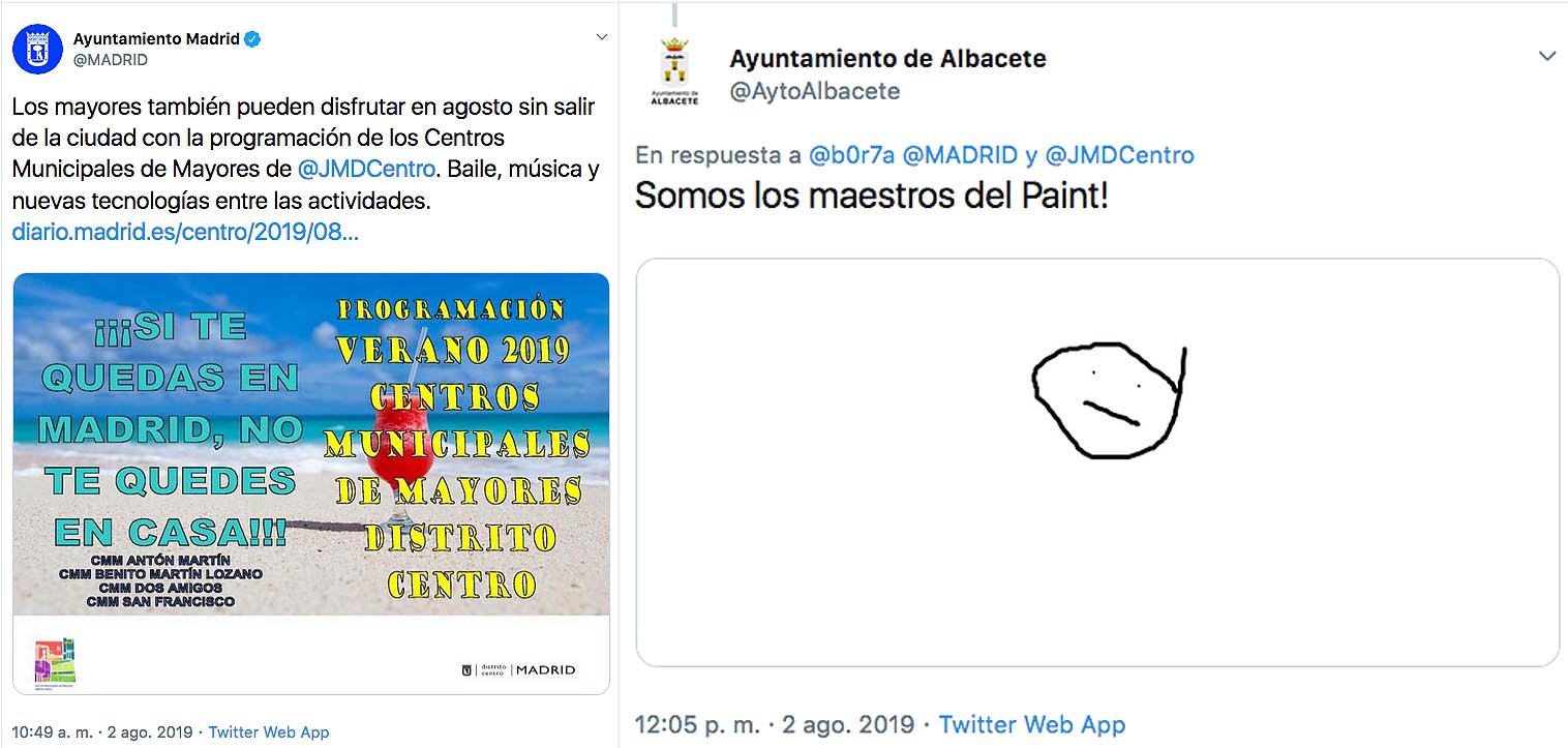 El último cartel del Ayuntamiento de Madrid ha desatado el humos de las redes sociales. No por su contenido, sino más bien por su continente. Y por su continente entendamos su diseño. Como cuenta El Mundo, lo rudimentario del anuncio de la programación veraniega para los mayores ha llamado la atención de los internautas y ni el Ayuntamiento de Albacete se ha resistido a contestar, por lo que ha sido noticia nacional.