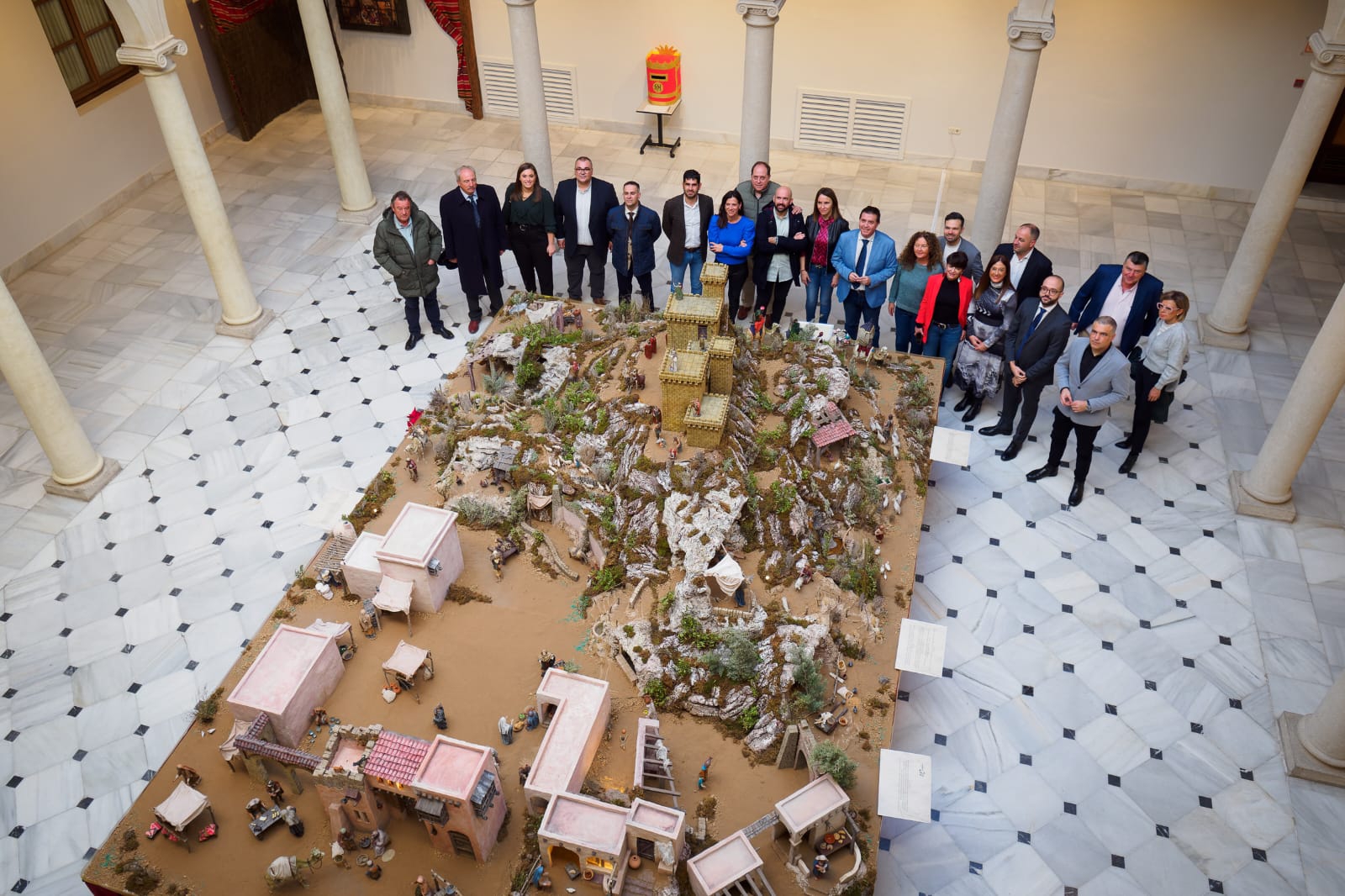 Por primera vez, el montaje ‘preside’ el Claustro ocupando toda su zona central ofreciendo una visita circular que permitirá a quienes acudan a disfrutar de él poder rodearlo y contemplarlo ‘a cuatro caras’, permitiendo así una visibilidad total tanto de las edificaciones como de unas figuras que tienen muchos detalles dignos de ser vistos desde todo ángulo y punto de vista posible.