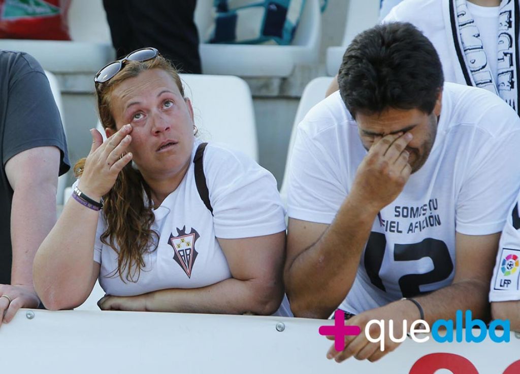 El partido en el Carlos Belmonte acabó en un mar de lágrimas. Vimos llorar a la afición pero también al equipo. Muy afectados estaban jugadores como Juan Carlos, al que vimos consolar a jugadores del Alcorcón. Muy triste estaba también el míster, César Ferrando. Esto huele a Segunda B de manera irremediable.