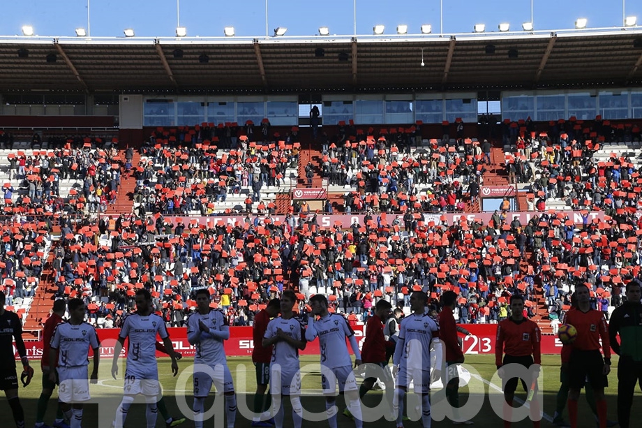 Los aficionados del Albacete Balompié, que hoy dan una imagen espectacular al Carlos Belmonte, han sacado miles de tarjetas rojas cuando los equipos y el conjunto arbitral saltaban al terreno de juego para protestar por los arbitrajes que recibe el equipo.