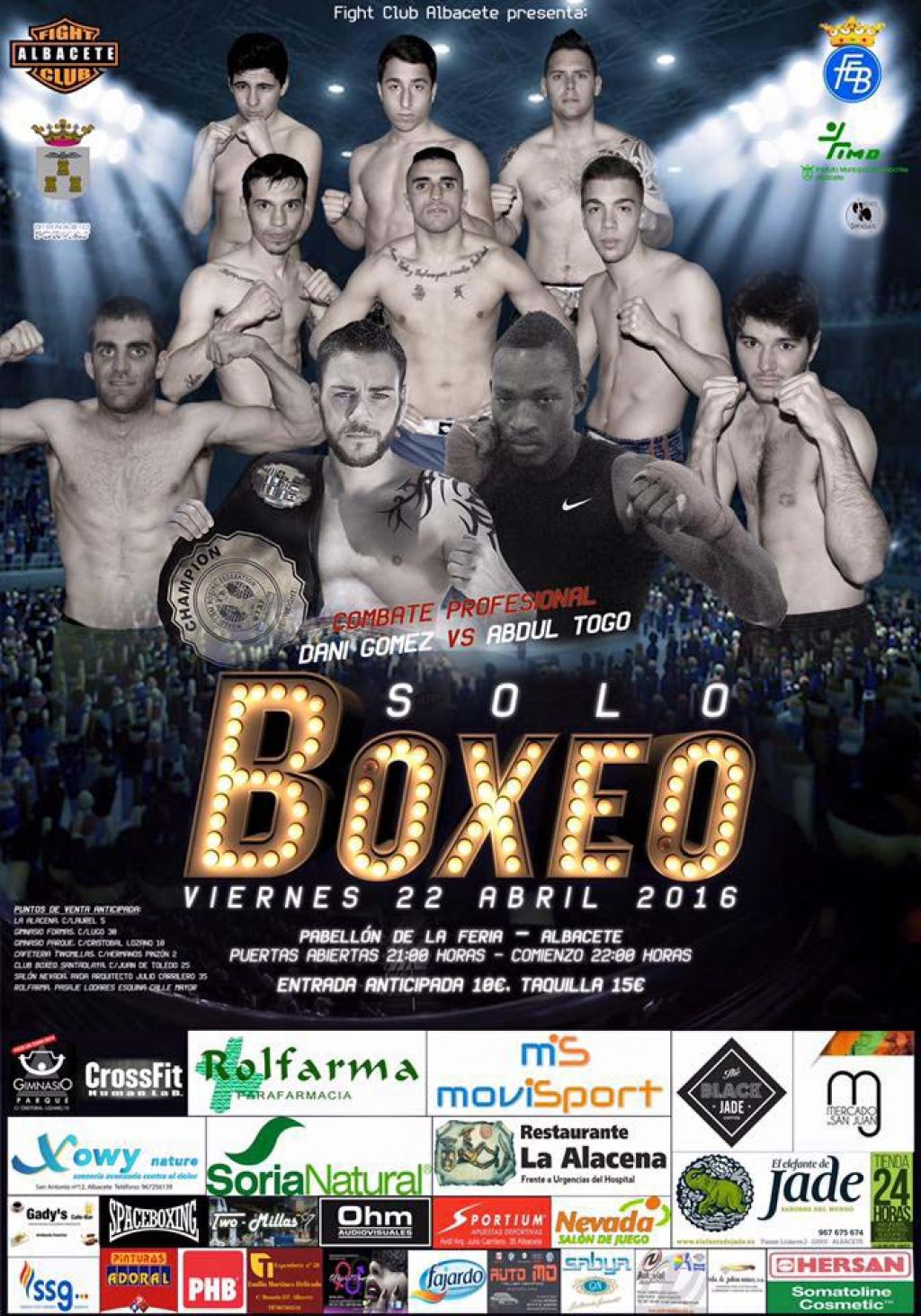 Seis púgiles locales subirán al ring tras los buenos resultados cosechados en los campeonatos de Castilla-La Mancha. La nueva perla de la cantera del Fight Club Albacete, Carlos Martínez, debutará con tan sólo 15 años en el peso semipesado. El zurdo Enrique Martínez buscará mantener su inmaculado récord. Carlos García “El Potro” volverá a pelear de nuevo después de sus exigentes compromisos en otras modalidades. El fajador Jordi Martínez medirá su progresión ante un duro rival de Alicante. Tras su emocionante final en los campeonatos de Castilla-La Mancha, Fernado Castillo combatirá de nuevo ante su público. El ídolo local Jesús Coy reaparecerá para fajarse con el ruso Even Lapinsky.