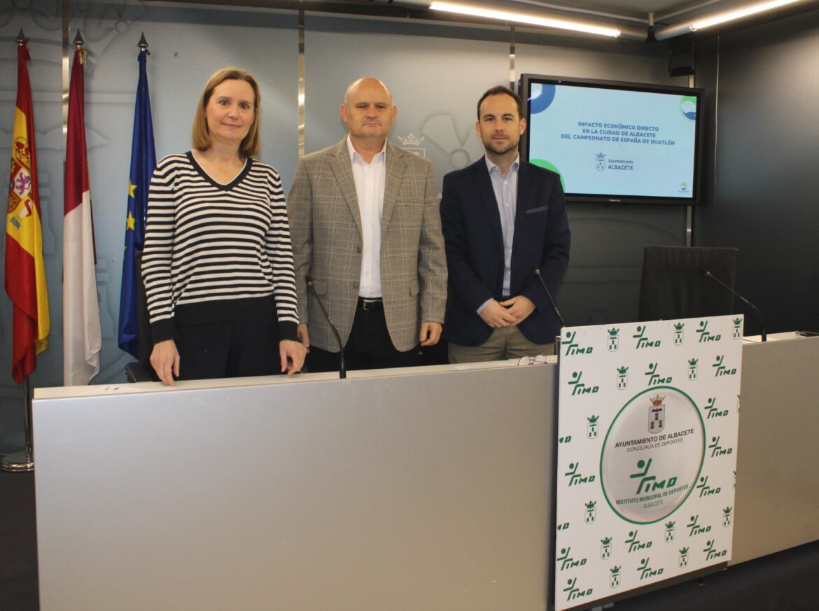 El concejal de Deportes, Francisco Villaescusa, ha informado del resultado del estudio de impacto económico que el Campeonato de España de Duatlón por Clubes celebrado los pasados días 24 y 25 de febrero ha tenido en nuestra ciudad, junto al especialista en análisis de datos de SCE Consultores, Carlos Mondéjar, y la gerente de la Asociación Provincial de Empresarios de Hostelería y Turismo de Albacete (APEHT), Begoña Garijo.