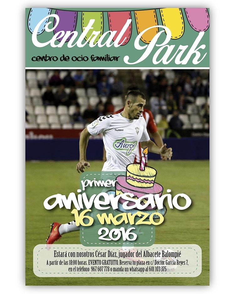 El centro de ocio familiar Central Park, en el número 7 de la calle Doctor García Reyes, por Parque Sur, celebra el próximo miércoles, 16 de marzo, su primer aniversario, con actividades gratuitas -previa inscripción en las instalaciones-. Al acto asistirá el jugador del Albacete Balompié César Díaz.