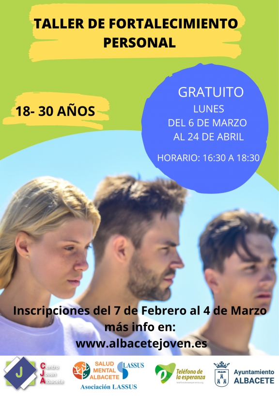 El Centro Joven de Albacete ha organizado un nuevo taller de fortalecimiento personal. Esta actividad formativa, que se llevará a cabo del 6 de marzo al 24 de abril, está integrada por ocho sesiones en las que se abordarán distintos aspectos en torno al crecimiento personal por parte de expertas en la materia. Para asistir al taller es necesario inscribirse en la web del Centro Joven de Albacete, www.albacetejoven.es.