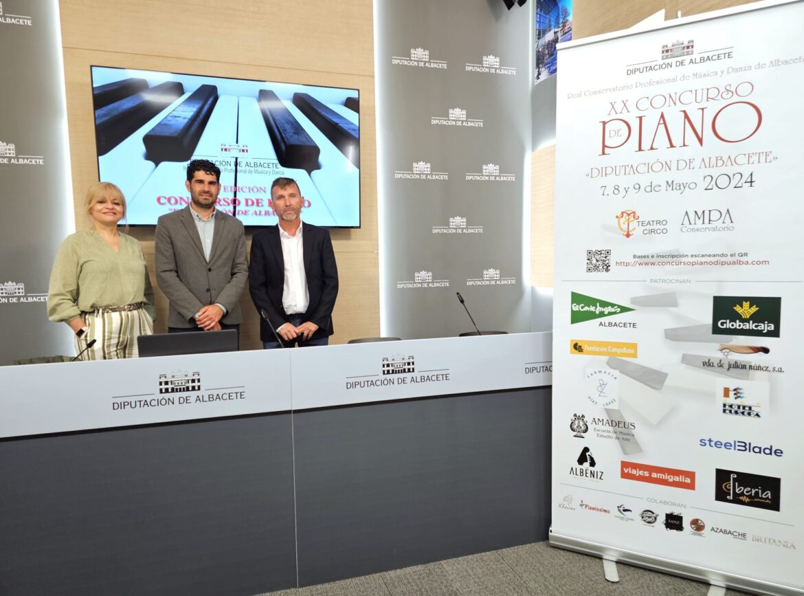 Este lunes, la Sala de Prensa de la Diputación de Albacete ha sido escenario de la presentación de la vigésima edición del Concurso de Piano ‘Diputación de Albacete’ que va a tener lugar del 7 al 9 de mayo. El diputado coordinador del Área Social, José González; el director del Real Conservatorio de Música y Danza de la Diputación, Jesús Díaz Valenciano; y la jefa de Estudios del citado Conservatorio, María Reyes Bernal, han dado los detalles.